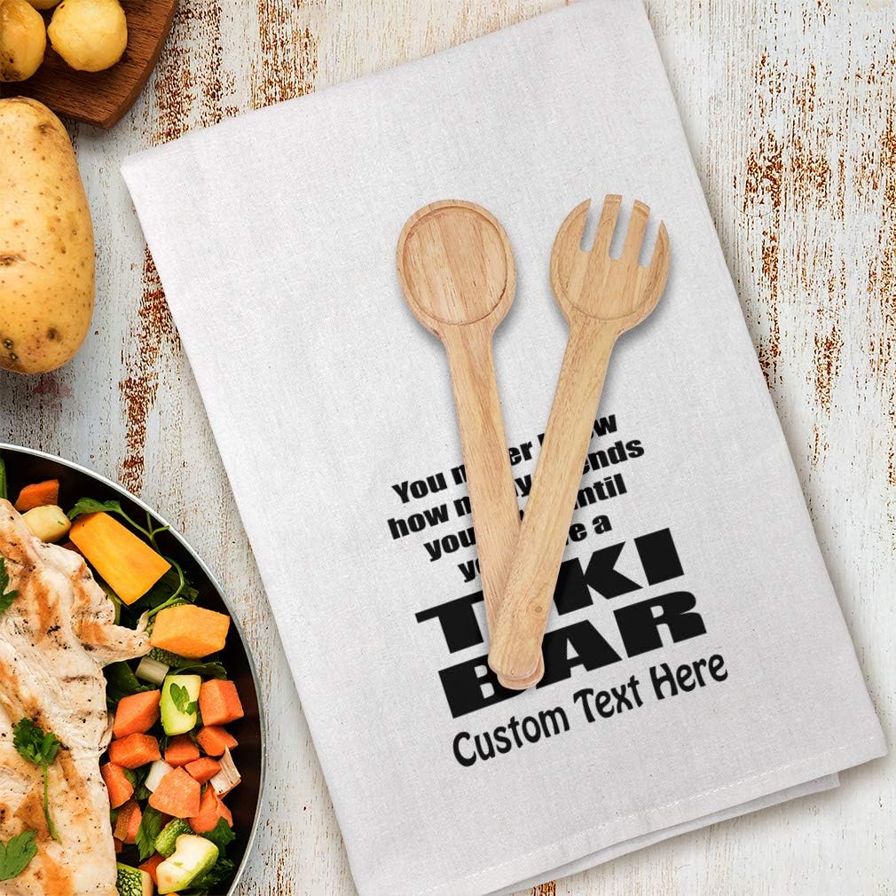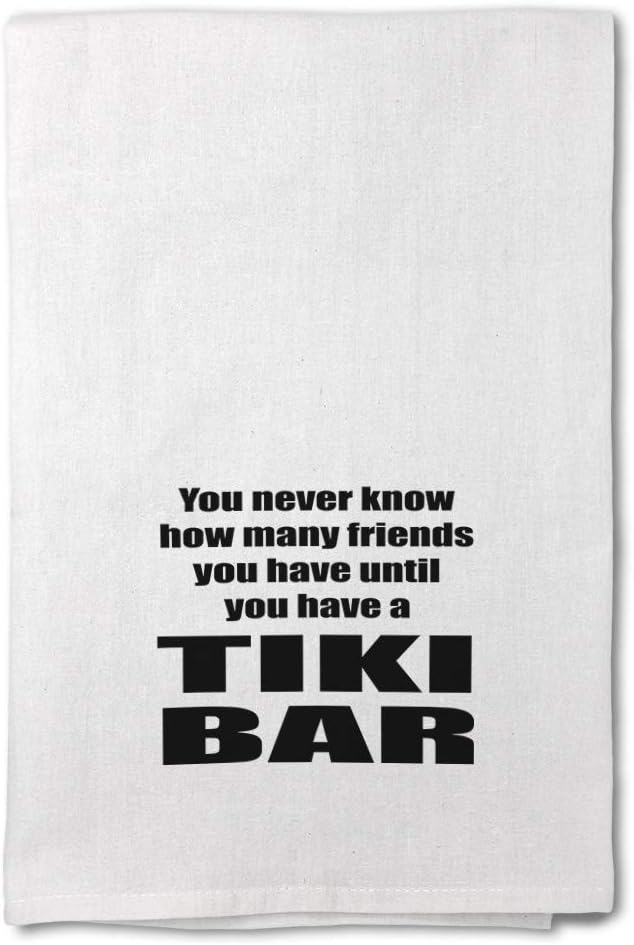Personalized Kitchen Towels Bar Accessories & Decor Dish Towels Cook in style with our 27x27 inches 100% cotton Eco-friendly kitchen towel. Make this hand towel your best companion. You can use this white hand towel in multiple ways such as drying dishes, wrapping bread, cleaning spills or simply take it with you in your picnic hamper! The design's text reads: you never know how many friends you have until you have a tiki bar GREAT HOUSEWARMING GIFTS IDEA: Unforgettable, our kitchen hand towels are the perfect for birthday gifts, anniversaries, Mother's Days, Father's Day, Valentine's Day, Christmas or any other celebrations. Perfect for someone who is looking for Friends You Have white hand towels, Tiki Bar kitchen dish towels, You Never Know tea towel, Have A Tiki Bar cotton towels, Friends in Tiki Bar kitchen dish cloths sarcastic kitchen towels, gag gift cotton dish towels, funny gifts hanging kitchen towels, household essentials, . You can make these large flour sack dish towels one of a kind with our custom option with thousands of designs and graphics available to you. Simply add your personalized text and choose among various fonts and colors! We have more than 12 years of experience in the printing industry to offer you stunning detail and rich lifelike colors. All prints are carefully made in our lab in Tampa, Florida. PERFECT COMPANION FOR COOKING & CLEANING! ** Made from high quality Eco-friendly 100% cotton ** Large size 27x27 inches ** Corner hanger loop for an easy hanging & display ** 4-sided hem for best durability ** Washer & dryer friendly for an easy care ** Design professionally printed ** Multiple usages: cooking, cleaning, drying, wrapping bread, picnic etc...