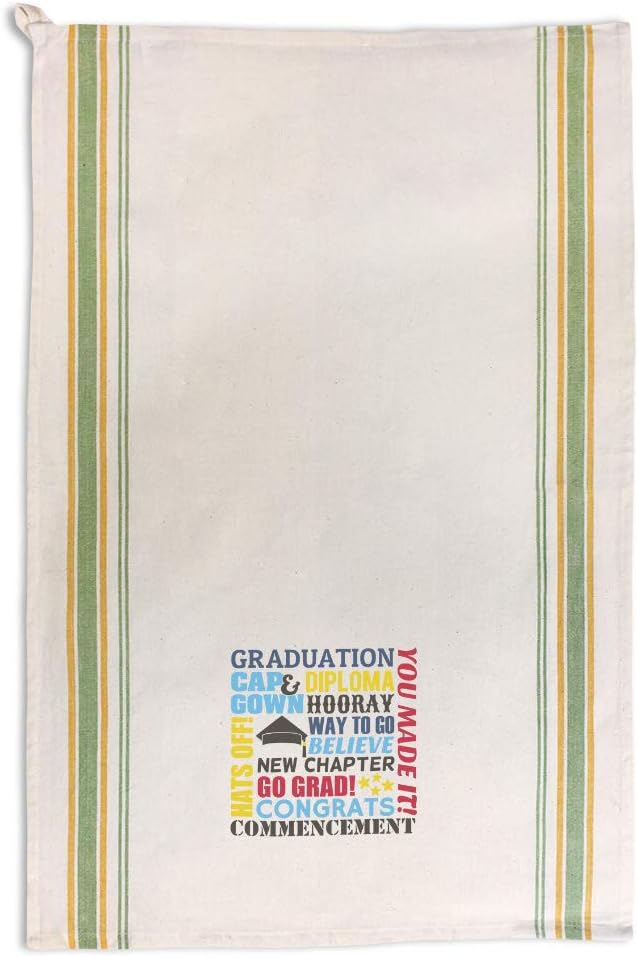 Personalized Kitchen Towels Bar Accessories & Decor Dish Towels Cook in style with our 18x28 inches 100% cotton Eco-friendly kitchen towel. Make this hand towel your best companion when you clean or cook delicious tasty meals in your kitchen. You can use this striped hand towel in multiple ways such as drying dishes, wrapping bread, cleaning spills or simply take it with you in your picnic hamper!The design's text reads: graduation cap & diploma gown hooray way to go believe new chapter grad! congrats commencement you made it! hats off!. GREAT HOUSEWARMING GIFTS IDEA: Unforgettable, our kitchen hand towels are the perfect for birthday gifts, anniversaries, Mother's Days, Father's Day, Valentine's Day, Christmas or any other celebrations. Perfect for someone who is looking for Graduation Cap white hand towels, Stars kitchen dish towels, Diploma tea towel, Gown cotton towels, Congrats kitchen dish cloths Novelty gifts kitchen towels, gag gifts cotton dish towels, funny gifts hanging kitchen towels, household essentials, . You can make these large flour sack dish towels one of a kind with our custom option with thousands of designs and graphics available to you. Simply add your personalized text and choose among various fonts and colors! Our designs are professionally printed on our dishcloths for kitchen with state-of-the-art equipment guaranteed to last for years. PERFECT COMPANION FOR COOKING & CLEANING! ** Made from high quality Eco-friendly 100% cotton ** Large size 18x28 inches ** Corner hanger loop for an easy hanging & display ** 4-sided hem for best durability ** Washer & dryer friendly for an easy care ** Design professionally printed ** Multiple usages: cooking, cleaning, drying, wrapping bread, picnic etc...