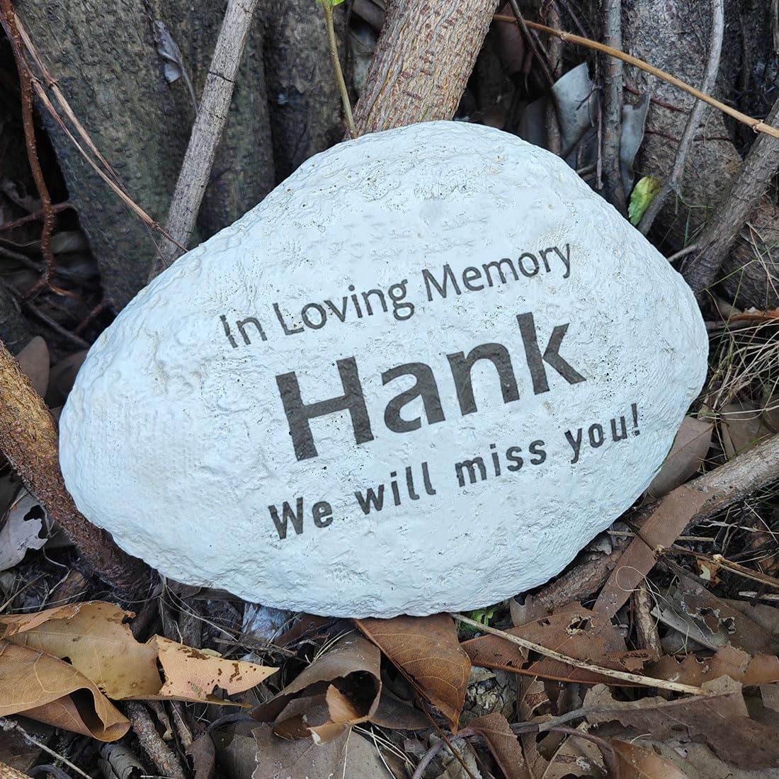 Features: 1. All content is customizable, Laser engraved, will last forever. 2. A realistically shaped artificial rockery stone is perfect for anywhere outside, by the walkway, on the lawn, under a tree, etc. 3. Measurement: Size 8 inches (Long)×2.5 inches (Wide)×4.5 inches (Hight), Weight 0.75 pounds. 4. Material: Made of resin, hand-carved and painted, hard to be damaged, suitable for indoors and outdoors. 5. No need to worry about damage during transportation,nice gift choice. 6. This is a magical stone, it can be a memorial stone, an encouragement stone, or a welcome stone, a decorative stone, grave marker, cemetery decoration stone. Use your imagination to let this stone convey emotions for you. 7. These memorial garden stones can be special gifts such as christmas gifts, birthday gifts, housewarming gift, mourning gift, memorial gifts for friend and family, gifts for brother and sister, gifts for mom and dad, gifts for grandfather and grandmother, anniversary gift, garden lover gift, Thanksgiving gifts, Christmas etc. Or loss of cat dog pet sympathy gifts, help a sad friend or lover to remember their loved one, express sympathy, comfort, remembrance, healing.