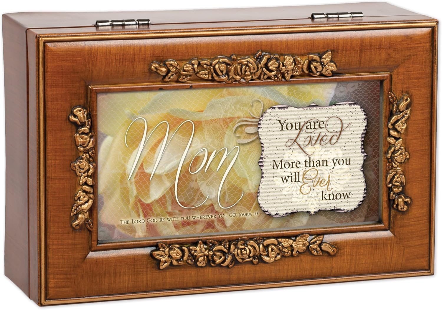 Cottage Garden inspirational and sentimental products are both lovely and classic in style. Be encouraged by a message that reads, "Mom, you are loved more than you will ever know. The Lord God be with you wherever you go." Designed by artists in the Heartland of America, Cottage Garden’s Collections reach a variety of tastes and have a wide range of occasions for gifting. Embossed rosette details with brushed gold toned accents. Jewelry box measures approximately 6 x 4 x 2.5 inches; Replace artwork with 3 x 5 inch personal photo. Features scripture from Joshua 1:9. Traditional wind-up mechanism engages music to play melodic tune Amazing Grace. Black velvet lined interior cushions your precious treasures; Decorative bun feet are padded to protect table top and shelf surfaces. Ships in protective packaging; Ready for giving to that special someone.
