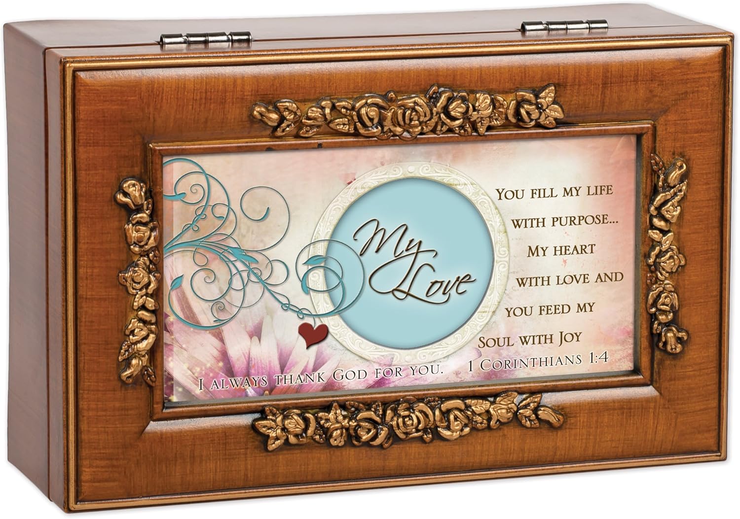 Cottage Garden inspirational and sentimental products are both lovely and classic in style. Be encouraged by a message that reads, "My love, you fill my heart with purpose . . . my heart with love and you feed my soul with joy. I always thank God for you." Designed by artists in the Heartland of America, Cottage Garden’s Collections reach a variety of tastes and have a wide range of occasions for gifting. Embossed rosette details with brushed gold toned accents. Jewelry box measures approximately 6 x 4 x 2.5 inches; Replace artwork with 3 x 5 inch personal photo. Features scripture from Corinthians 1:4. Traditional wind-up mechanism engages music to play melodic tune Unchained Melody. Black velvet lined interior cushions your precious treasures; Decorative bun feet are padded to protect table top and shelf surfaces. Ships in protective packaging; Ready for giving to that special someone.