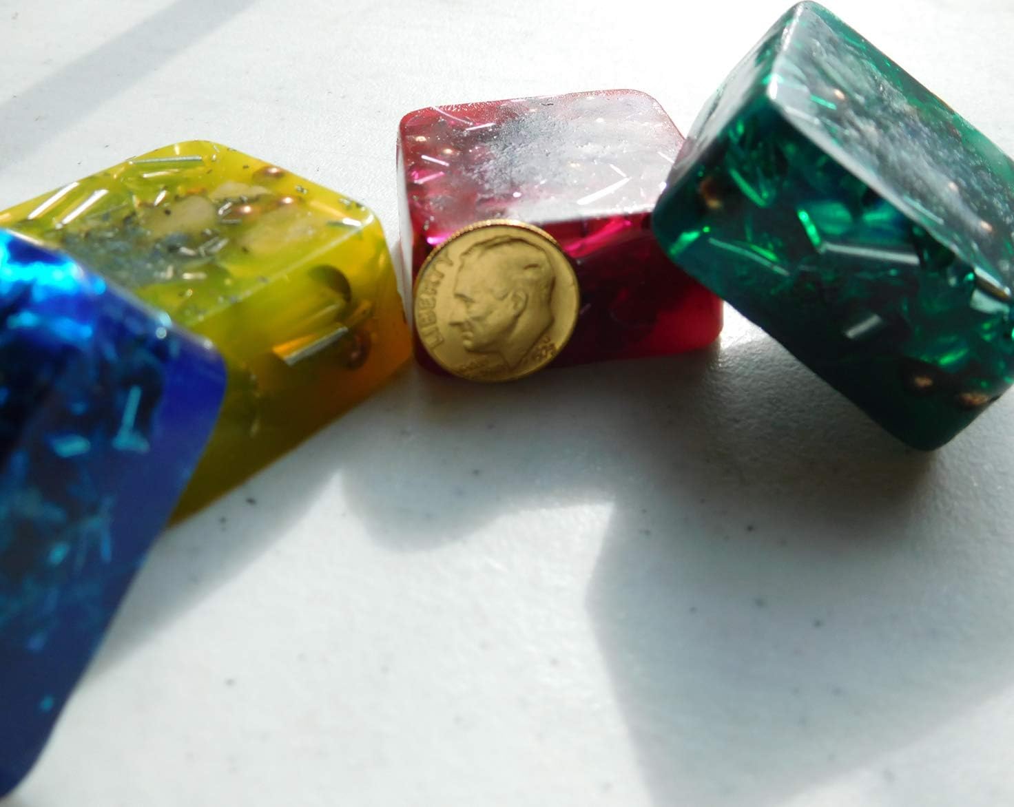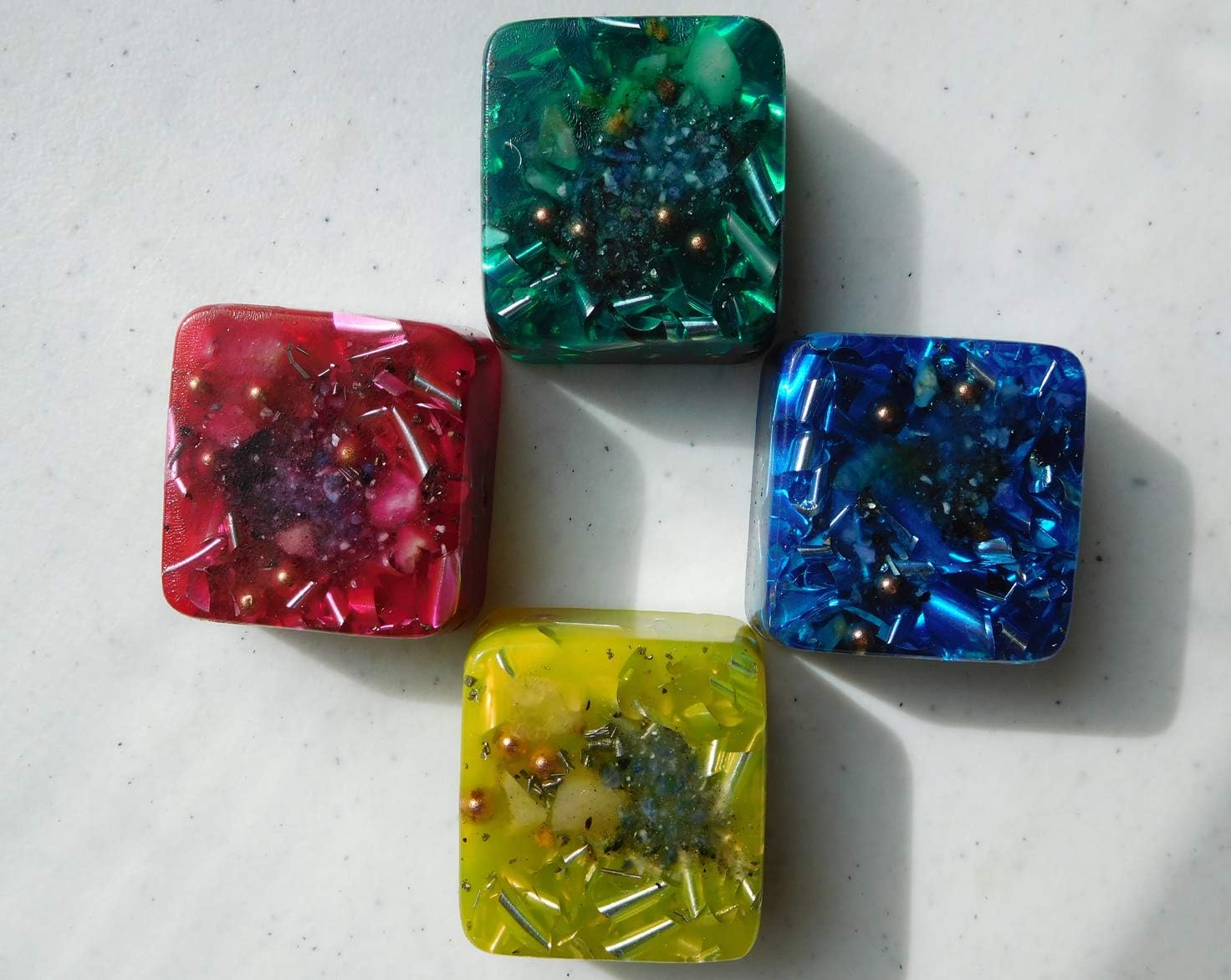 Positive Orgone Generator _______________________________________________________________ _______________________________________ Size: Width Top 1 ½"-38mm Base 1 ½”-38mm Height 1/2"-13mm Mini Cube Tower Buster Orgone Generator Energy Accumulator _____________________________ *Intentions Love, Strength, Power, Healing, Calm, Clarity, Creativity, Abundance, Prosperity** Made with Love* GIFT with every complete order**Thanks For Looking! ___________ Orgone is a handmade product and may have some small imperfections such as bubbles or texture variations; this in no way affects the quality or function of the orgone devices. ++++ Thanks for your orders! +++++ Aids in the transmutation of stagnant/negative energies & EMF waves (DOR=dead Orgone energy) into a more positive form (POR-positive Orgone energy) Orgone takes Deadly Orgone Radiation (DOR) and turns it into Positive Orgone Radiation (POR). Simply put POR is the creative life force in nature. Orgone generators are also thought to mitigate the harmful effects of Electromagnetic waves, ELF and HAARP waves in your environment. Put them near your TV, computer or anywhere in your living space. Even put them in your garden and watch it flourish a bloom like never before::Disclaimer: We make no medical claims about our products. If you have a medical conditions please consult a physician. _____________________________________________________ ::Note: These are handmade art pieces, size may vary slightly from piece to piece. You will receive 4 Tower Buster similar to the pictures 1 of each color. All Handmade! ++++++++.