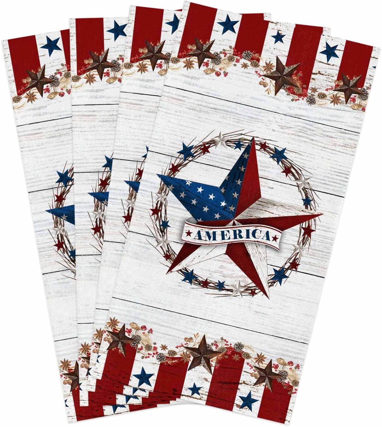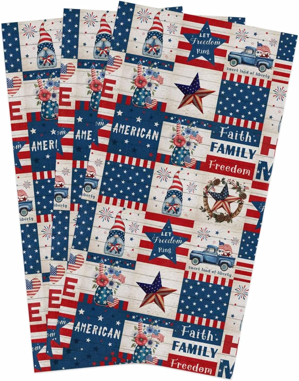 4th of July Patriotic Kitchen Towel Sets for Bathroom Seasonal Holiday Memorial Day Independence Day DecorationsProduct DescriptionSize Dimensions:Each Dish Towel 15.7x23.6 InchSet of 1/2/3/4Premium & Absorbent MaterialThe dish towels for kitchen are made of absorbent material, lightweight, highly absorbent, and quick-drying making them perfect for cleaning and suitable for all your household tasks.Ideal Kitchen AccessoriesOur dish towels will refresh your kitchen, is easy to mix and match with other kitchen decorations. Add flair to your kitchen decor with colorful kitchen dish towels.Precise EdgingExquisite edging and cable routing can improve reusability, and it is not easy to tear, wear and lose the thread after cleaning.More Scene UsesBoth decorative and practical, it is an ideal choice for your kitchen, restaurant, hotel, coffee shop, dessert shop, bathroom, and other occasions. Great for drying off dishes, these versatile towels are perfect for wiping your hands, cleaning up kitchen counters, carrying hot dishes, and much more. They can be hung anywhere after use.Vibrant Pattern & Perfect GiftOur hand towels come in a variety of vibrant colors and patterns for each season and occasion. Give your space a real personality, the perfect gift for various holidays.Easy CareMachine washing in cold, do not bleach, tumble dry low and low iron if needed.