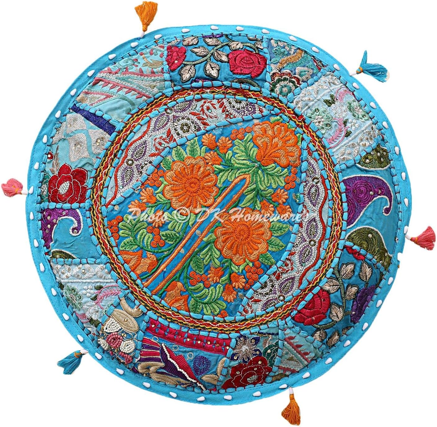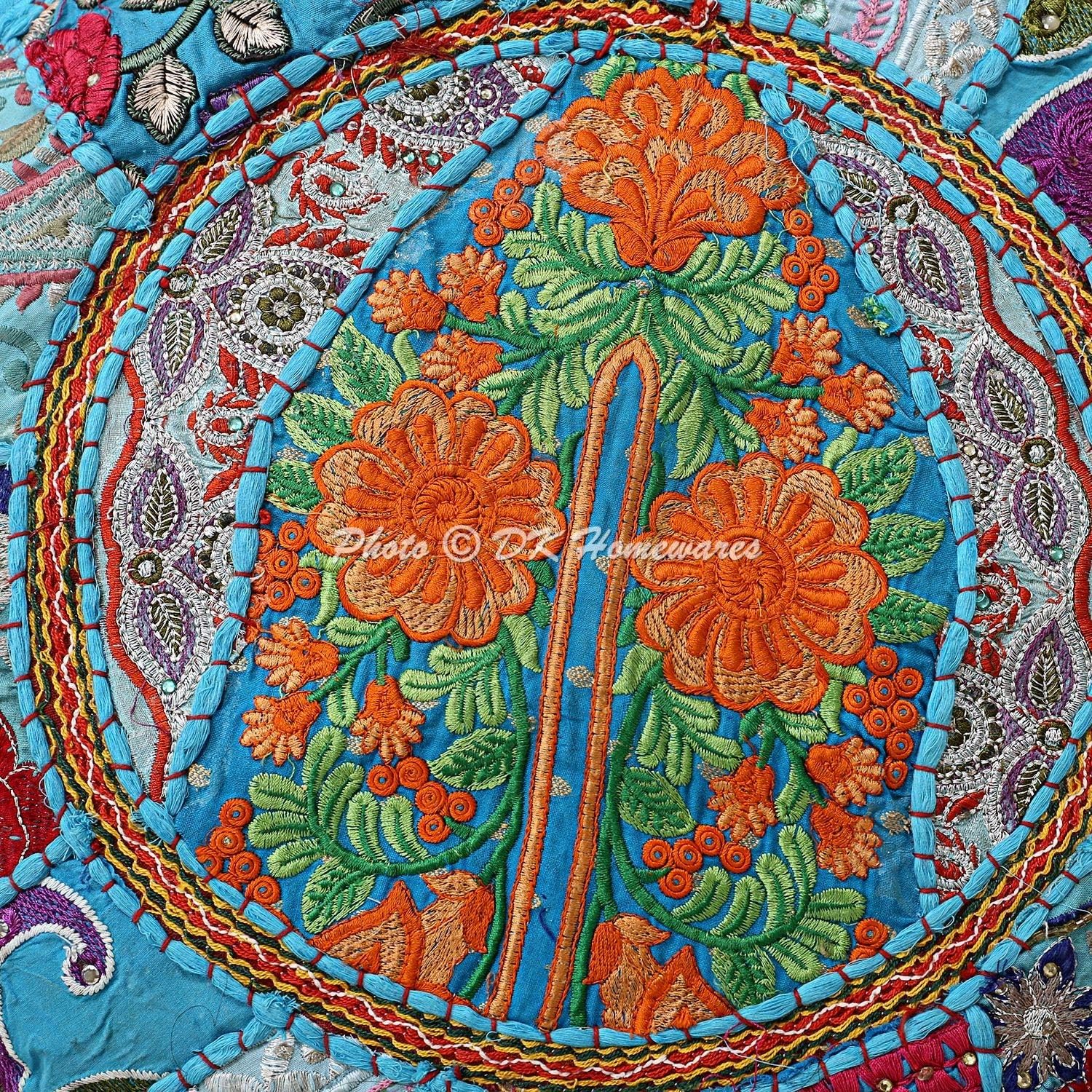 You are looking at traditional Ottoman Pouf Cover decorated with embroidery. It is made using old dress fabric patches. The various patches are stitched together at random to create a collage like effect and decorated with all kinds of colored threads, patchwork, raised colored thread work and embroidery in intricate designs with beautiful mirror & tassel work. PLEASE NOTE THAT IT IS A COVER ONLY AND THE INSERT IS NOT INCLUDED. The pouf cover has a zipped closure at the bottom which can be used to stuff the cover easily at home. THERE WILL BE VARIATION IN THE PATCHES HOWEVER THE BASE COLOR OF THE POUF COVER WILL REMAIN SAME. THIS UNIQUENESS IS NOT AN IMPERFECTION AND IS ACTUALLY A SPECIALTY OF THE PRODUCT. As these are made using old fabric patches, missing sequins, broken or tarnished mirrors, as well as bead & sequin loss may be observed and should not be treated as a defect and instead accepted as it is.
