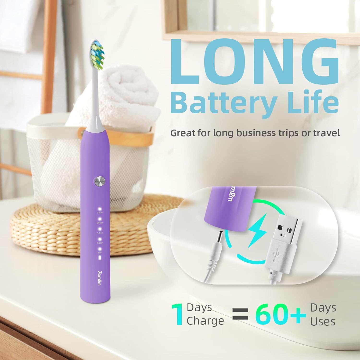 7AM2M Sonic Electric Toothbrush adopts the advanced sonic technology that vibrates at up to 40,000 times per minute to effectively remove plaque for a more efficient and convenient dental cleaning experience. The cleaning effect is more obvious than a manual toothbrush, more gentle brushing than a rotary toothbrush, and more protective of tooth enamel. Five cleaning modes can be adapted to different dental cleaning needs. The 2-minute smart timer helps you keep brushing for the right amount of time. Over time, the blue bristles on both ends will gradually fade to white, notifying you to pay attention to replacing the brush head. Just try it! A week of use can help reduce the dental plaque and you get a healthy oral environment. Two weeks of use can completely improve your oral health and help you smile confidently:)
