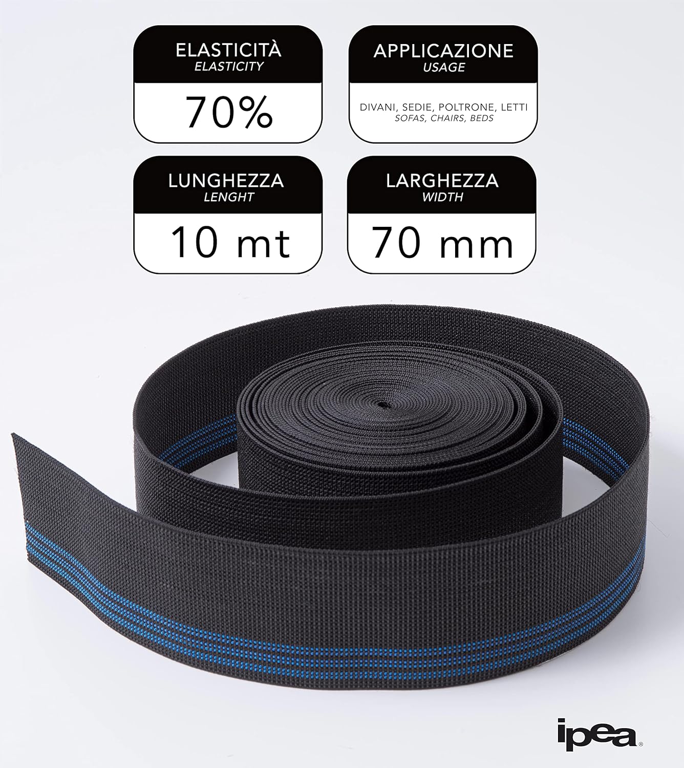 IPEA Elastic Strap for Sofas, Chairs, Armchairs – [10 Metres] – Made in Italy – 70 mm Wide – 3 Rows for Upholstery, Seats, Backrests – Elastic Strap – Elasticity 90%