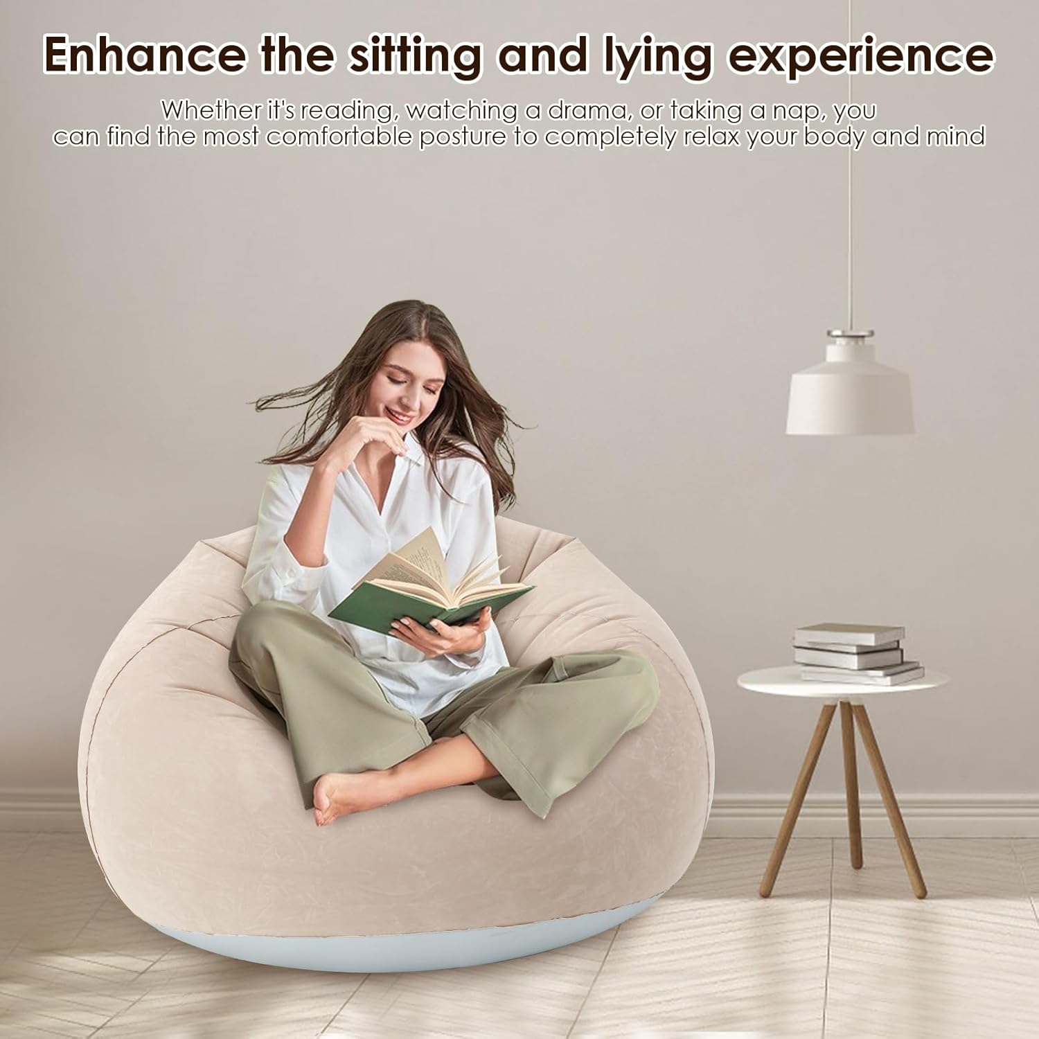 Parts List:1 x Inflatable Lounge ChairDescription: Introducing our inflatable lounge chair. It is crafted from PVC material with a thickened bottom, which is resistant to pressure and abrasion, and has a strong bearing capacity. The surface is made of flocking material, which is soft to the touch. Featuring a convenient inflatable design, it folds into a compact package for easy storage and portability, saving space. Key Feature: Foldable Design: Inflatable lounge chair adopts foldable design that doesn't take up much space and is easy to carry. When not in use, it can be stowed away to keep your home neat and tidy, both convenient and comfortable.Specification: Product Name: Inflatable Lounge ChairSize(after inflated): 110x110x85cm/43.3x43.3x33.46inch Load: 80 kilogramsMaterial: PVC + FlockingColor(Optional): Grey/BlueNote: 1.There may be slight differences between the picture and the actual color of the commodity. We will try our best to show you the exact color.2.Please allow slight dimension difference due to manual measurement.3.Inflatable pump is not included; just inflate the sofa until the whole becomes hard, no need to be too full to avoid product rupture.