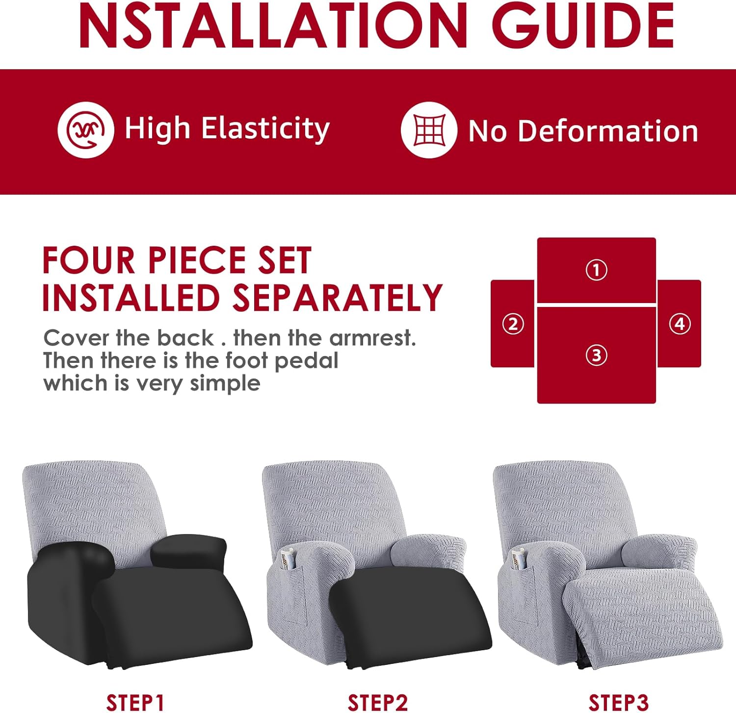 Description:Consisting of polyester and spandex, it is highly elastic and protects your furniture from scratches, dust and pet hair. It is also easy for you to change and clean. This stretchy recliner cover is easy to use and allows you to change your decor without buying new furniture.Key Feature:Stretch Fabric: Consisting of the premium polyester and spandex, this cover is highly elastic, ensuring it stays in place and protecting your furniture from scratches, dust and pet hair.Versatile: This recliner cover protects furniture from damage, which makes it easy to change and clean, and is a decorative addition to your furniture.Specification:Product Name: Recliner Chair CoverMaterial: Polyester + Spandex,Applicable size: backrest width: 24-33 in (61-84 cm), total height: 29-37 in (74-94 cm), footstool width: 34-37 in (61-94 cm), cushion width: 26-34 in (66-86 cm)Applicable: Sofa type: Single seat sofa/reclinerNote: 1. There may be slight color differences between the product picture and the actual item. We will do our best to display the color as accurately as possible. 2. Please allow slight dimensional discrepancies due to manual measurement. Parts List:Back cover X 1 Cushion cover X 1 Armrest cover X 2