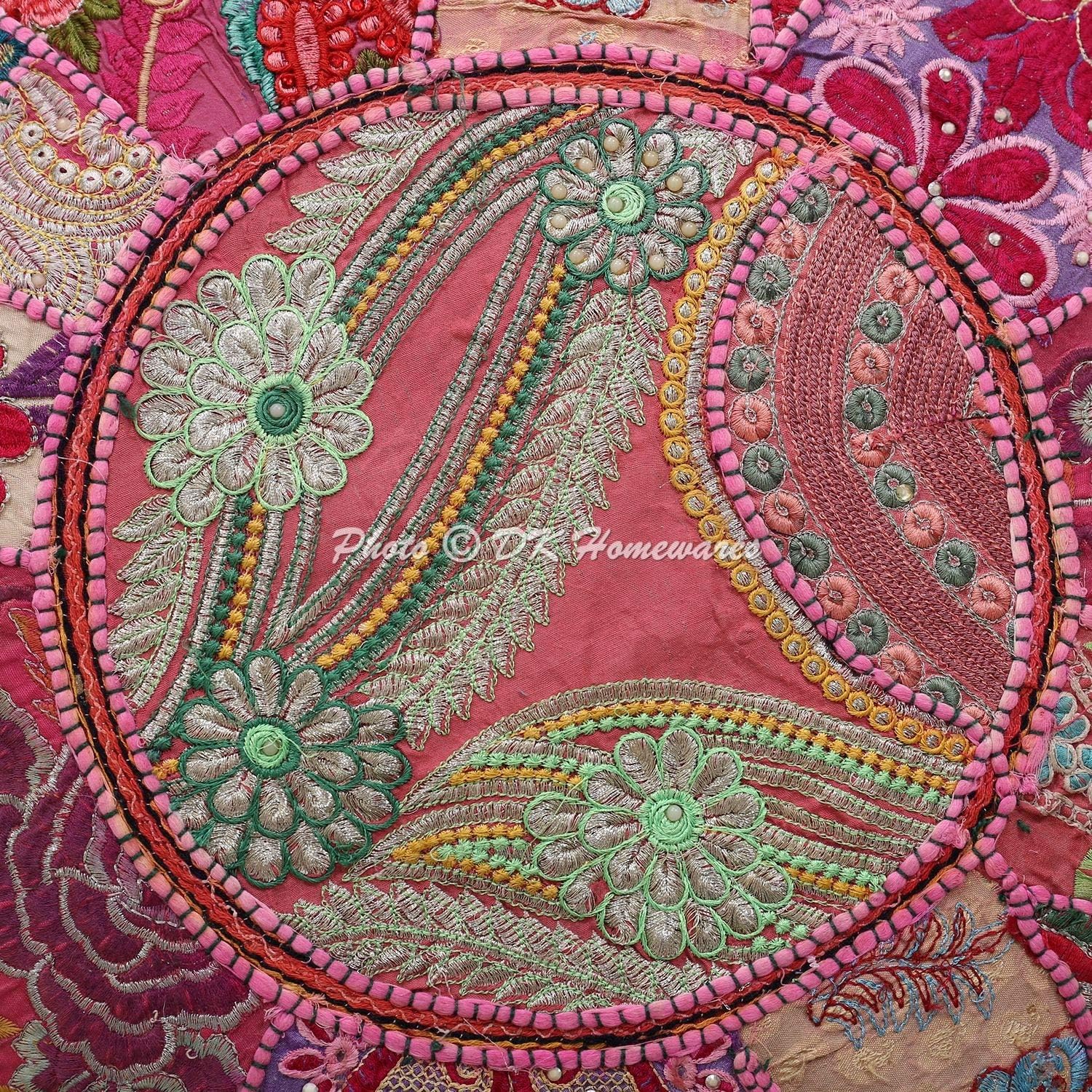 You are looking at traditional Ottoman Pouf Cover decorated with embroidery. It is made using old dress fabric patches. The various patches are stitched together at random to create a collage like effect and decorated with all kinds of colored threads, patchwork, raised colored thread work and embroidery in intricate designs with beautiful mirror & tassel work. PLEASE NOTE THAT IT IS A COVER ONLY AND THE INSERT IS NOT INCLUDED. The pouf cover has a zipped closure at the bottom which can be used to stuff the cover easily at home. THERE WILL BE VARIATION IN THE PATCHES HOWEVER THE BASE COLOR OF THE POUF COVER WILL REMAIN SAME. THIS UNIQUENESS IS NOT AN IMPERFECTION AND IS ACTUALLY A SPECIALTY OF THE PRODUCT. As these are made using old fabric patches, missing sequins, broken or tarnished mirrors, as well as bead & sequin loss may be observed and should not be treated as a defect and instead accepted as it is.