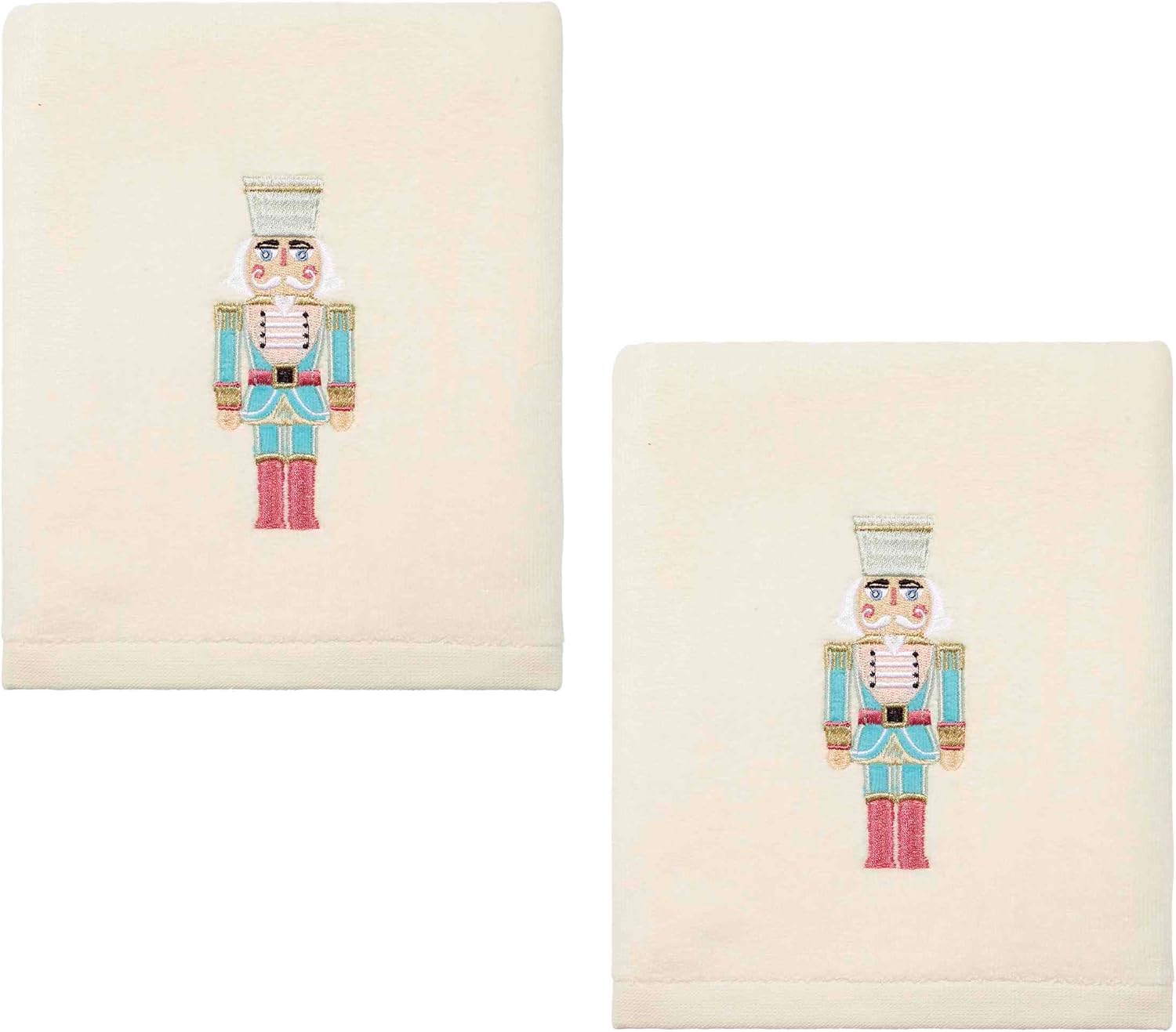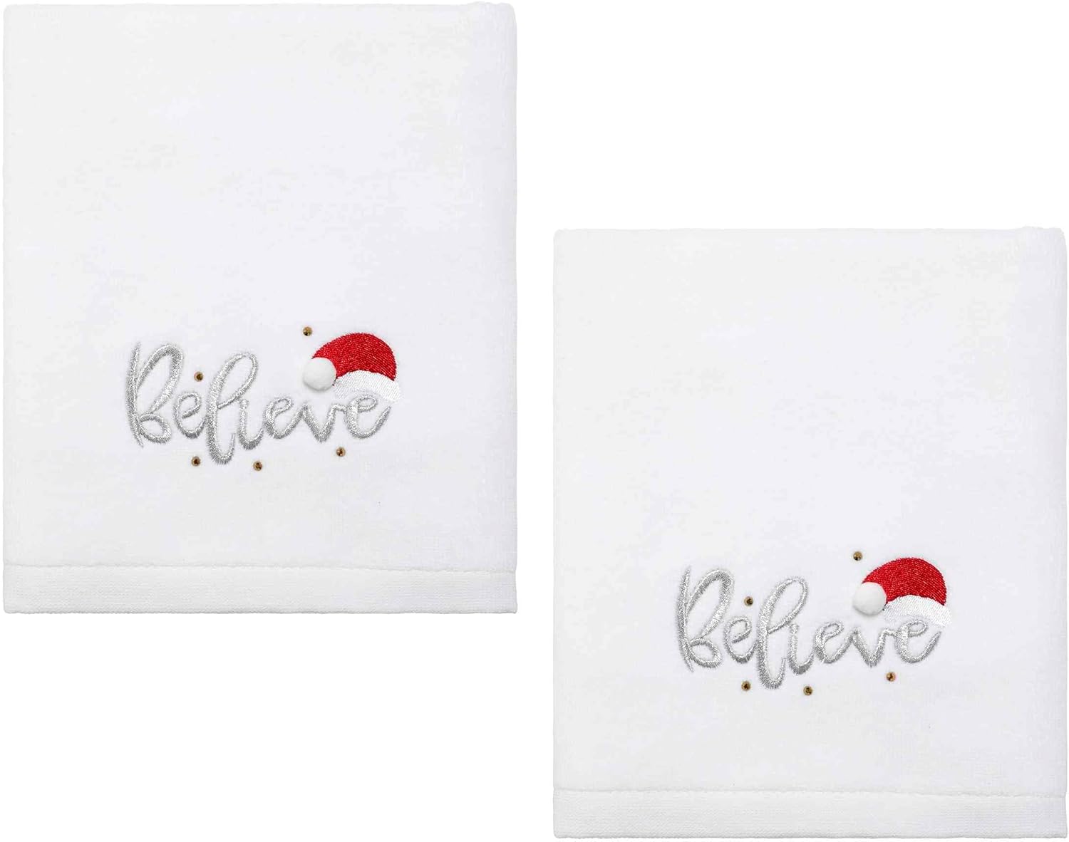 The Avanti Snowman Decorative Hand Towel 2-Pack features an embroidered happy, accessorized snowman with appliqued white satin fabric and real buttons. Metallic silver snowflakes add a bit of glitter. Set includes two 16" x 28" 100% cotton (excl. of embellishment) white velour towels.