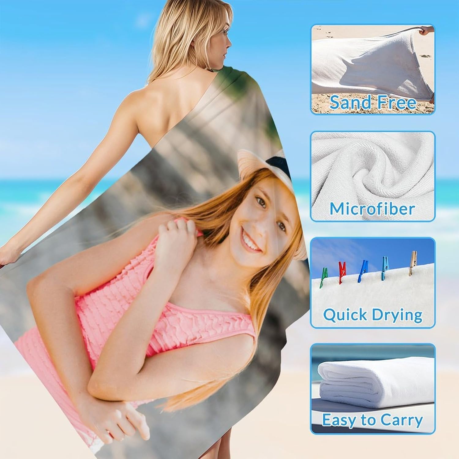 Personalized Beach Towel - Your Summer Companion Elevate your summer experiences with our personalized beach towel, designed to combine practicality with style. Material: 100% Polyester Microfiber Product Features: Vibrant & Colorfast Prints: Our beach towel features bright, fade-resistant prints that maintain their freshness wash after wash. Highly Absorbent & Quick-Drying: The unique microfiber fabric ensures rapid water absorption and efficient drying, making it perfect for poolside lounging or beach adventures. Soft & Plush Texture: The towel's plush texture offers a comfortable, skin-friendly feel, doubling as a cozy blanket for relaxation. Versatile Usage: Whether you're at the beach, pool, gym, or picnic, this towel is your ideal companion. It also makes a thoughtful gift for special occasions. *Washing Instructions: Avoid washing at temperatures above 40°C to prevent damage. Initial wash may cause slight color transfer due to the soft fibers and dye residue; this is normal and not indicative of fading. After washing, gently pat the towel dry in the direction of the hair to preserve the original pattern. Do not wring it out.