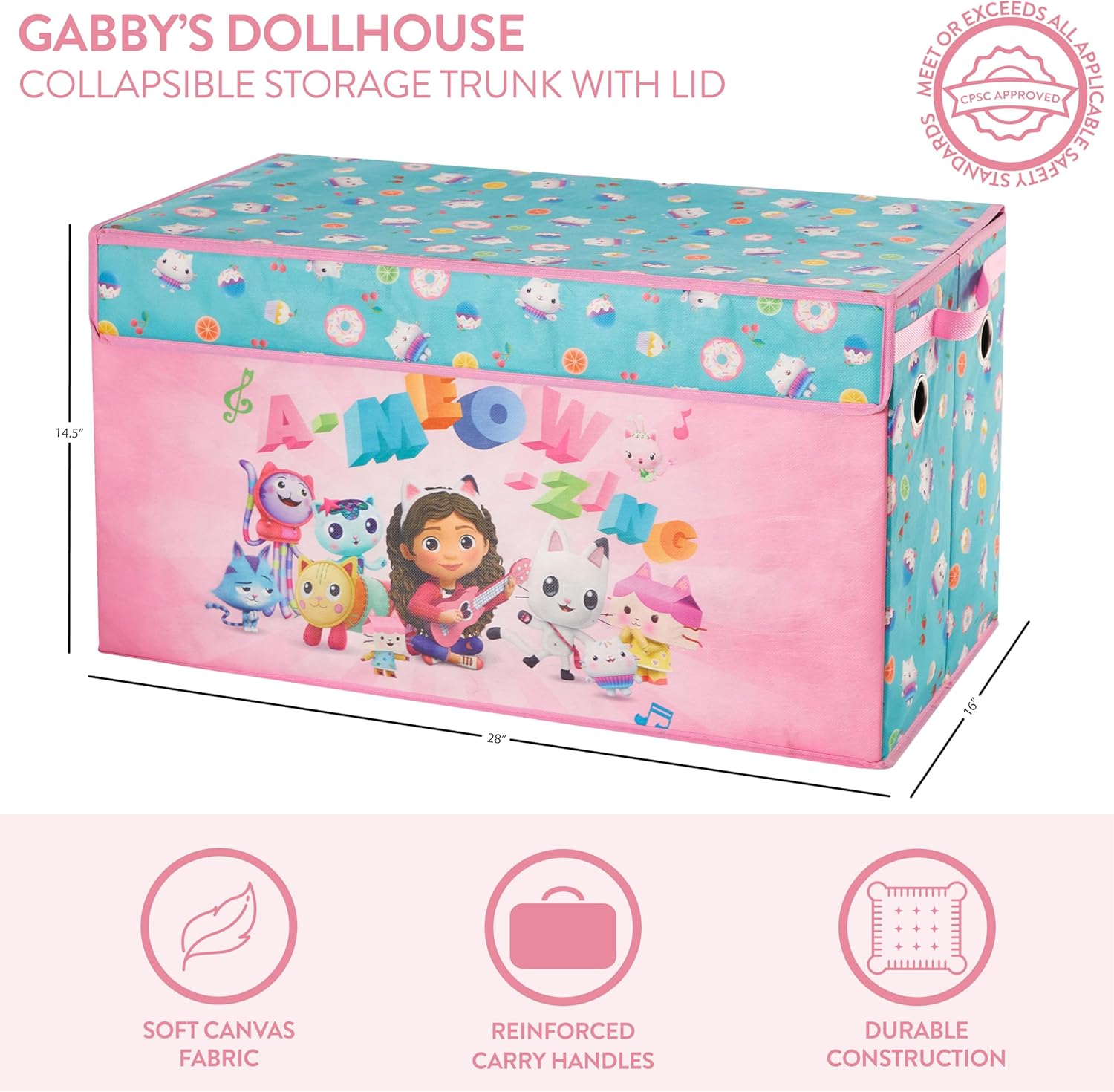 The Gabbys Dollhouse storage trunk makes a perfect addition to your child's bedroom, closet, or playroom. The storage trunk is an easy way to maintain clutter while adding a playful accent. Your little one will love to put away all their games, books, clothing and more in this spacious storage trunk featuring his or her favorite characters. It's made of a soft non woven material, so you never have to worry about the lid slamming down. Collapsible and lightweight, our storage chests are perfect for storing just about anything. When not in use, it can fold down flat and be tucked away. It is not meant for sitting or standing.