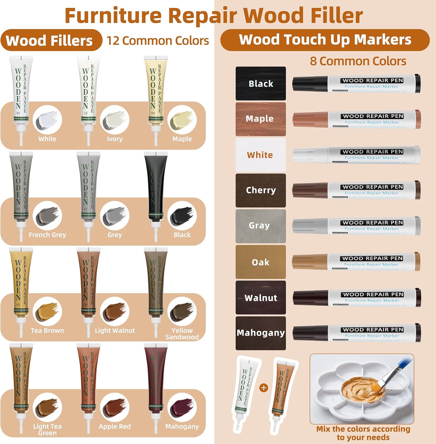 Wood Repair Kit for Furniture Package Including: 12 x Wood Filllers-White/Ivory/maple/French Grey/Gray/Black/Tea Brown/Light Walnut/Yellow Sandalwood/Light Tea Green/Apple Red/Mahogany 8 x Wood Touch Up Markers-Maple/Black/White/Walnut/Gray/Cheery/Oak/Mahogany 1 x Palette 1 x Scraper 3 x Brushes 2x Sandpapers 1 x Sponge How to Use When repairing deep scratches or veneer chips, apply the wood fillers and smooth it out with a scraper or the tip of a tube; for minor surface scratches, simply use a furniture marker in the matching color to cover them immediately.Tips: Note: Allow 48 hours for complete drying, and avoid contact with water