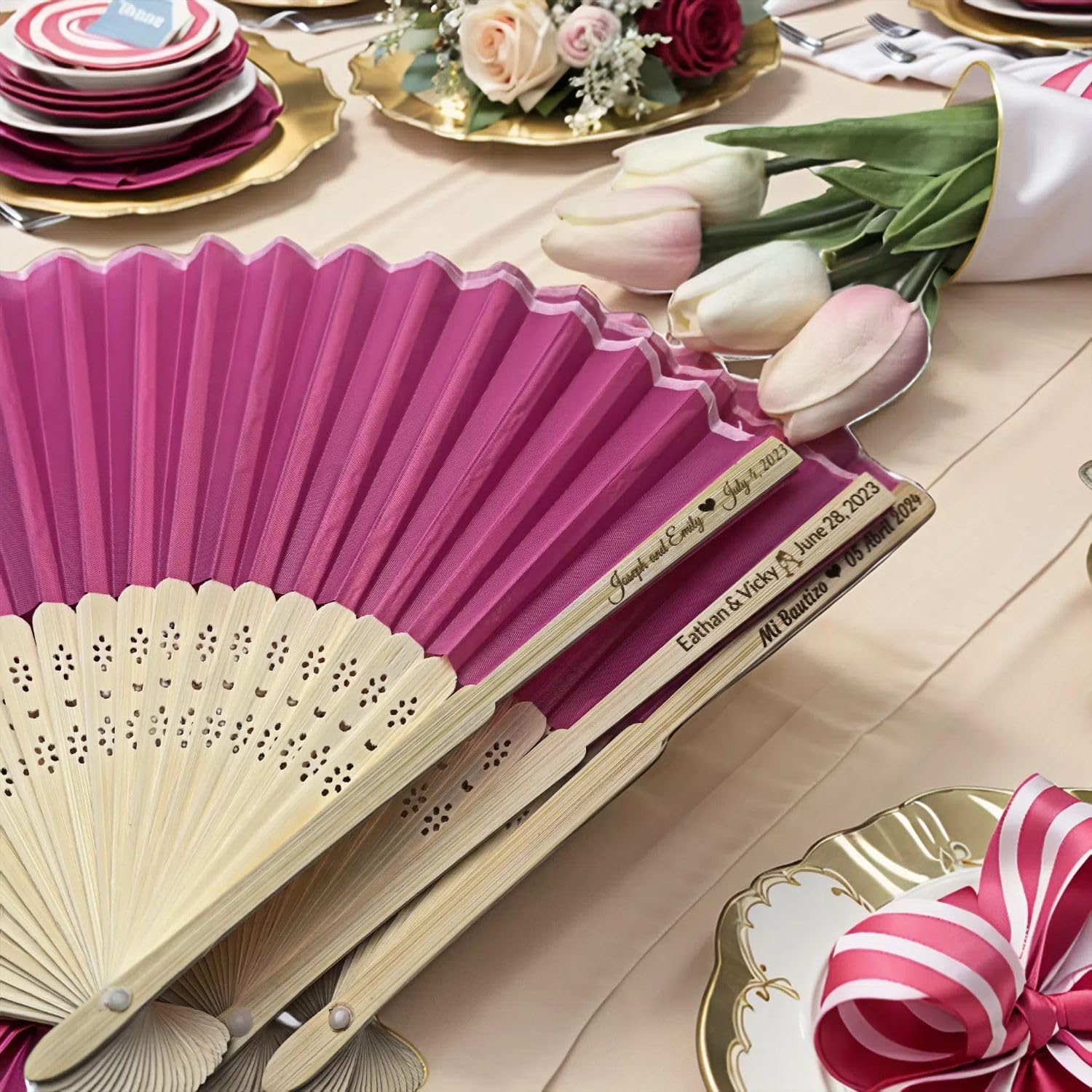 Features:* Ideal for keeping cool, folding into small spaces, easy to carry* Suitable for weddings, residences, offices, stages, parties and festivals, bridal shower favor, baby shower,Christmas Gift* With a pleasant faint aroma, these fans will bring you a fresh and elegant feeling*Customizable with laser engraving: Add a personal touch to your fan by having a special message, name, or design engraved with precision using our advanced laser technology.Product description:The Silk Fan-Rose red design adds a touch of elegance, and the best part is that each fans can be customized with laser engraving. Simply click on "Customize Now" to start creating your very own unique fan with a special message, name, or design. Material: Silk and Bamboo * Color: natural bamboo primary color and Rose red * Specifications: 8" x 1" x 1" inches (Folding) - ( 20 x 2.5 x 2.5 cm), 13" x 8" inches (unfolded) - ( 33 x 20 cm) Package Contents: Qty * Silk fans These fans are not only practical, but they also serve as a beautiful decorative piece, perfect for weddings, graduations, parties, and festivals.