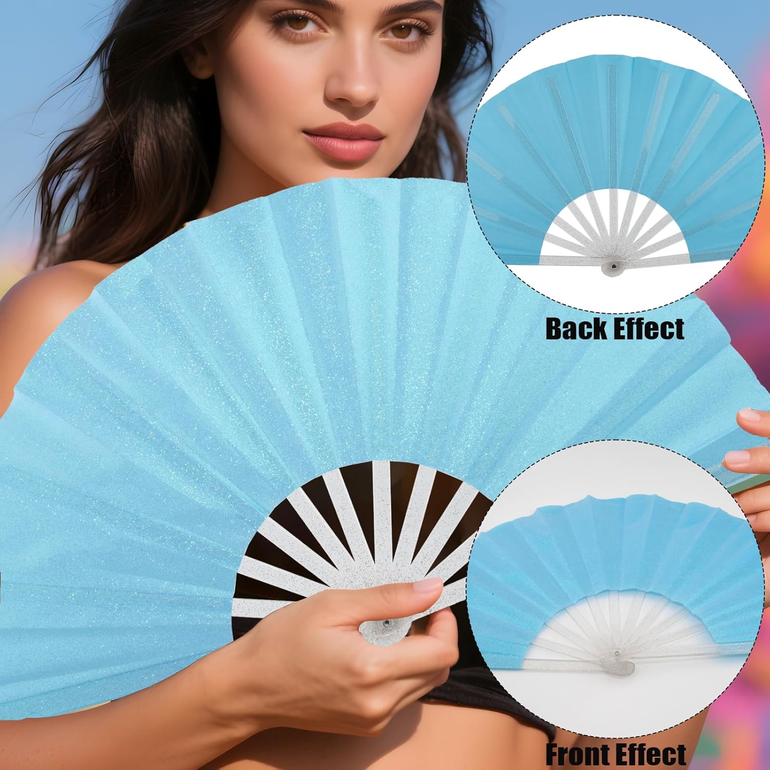 Make a bold statement with the 13-Inch Foldable Hand Fan, a dazzling and functional accessory perfect for raves, festivals, dance performances, and home décor. This fan is made of shiny polyester fabric and GPPS structure, which is both stylish and durable. This fan has a unique design with a flashing effect, shining brightly under the light and making a unique "click" sound when turned on.. Measuring 26 inches when open, it delivers powerful airflow to keep you cool during summer nights or crowded events. Whether you're heading to a music festival, preparing for a line dance performance, or looking for a decorative fan for your home, this foldable hand fan is the ultimate choice. Available in 10 vibrant colors and perfect for gifting to ravers, dancers, or party lovers.