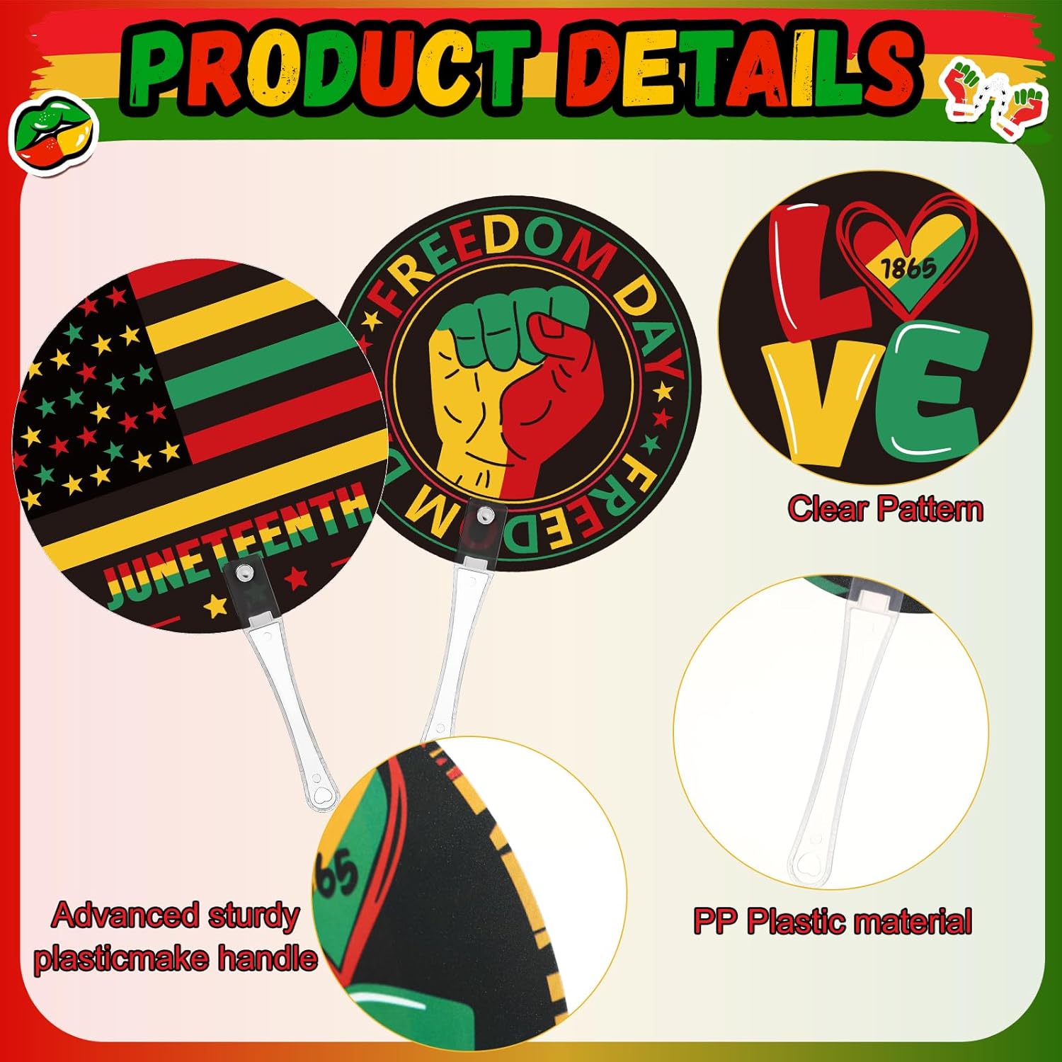 Features: Promote unity and celebration: Juneteenth hand fans are not only a practical accessory, but also a symbol of unity and celebration. They help people gather together at events to celebrate the significance of freedom and history. Each fan represents respect for history and hope for the future, encouraging everyone to communicate, share stories and experiences during the event. This positive atmosphere allows every participant to feel the warmth and support of the community. Share happiness: With these hand fans, you can not only express your support for Juneteenth, but also share the joy of celebration and the power of unity with your relatives and friends. Specifications: Material: PP plastic Color: black Size: about 6.69 x 6.69 inches/ 17 x 17 cm Package includes: 100 x Fans Notes: Manual measurement, please allow slight errors on size. The color may exist a slight difference due to different screen displays.