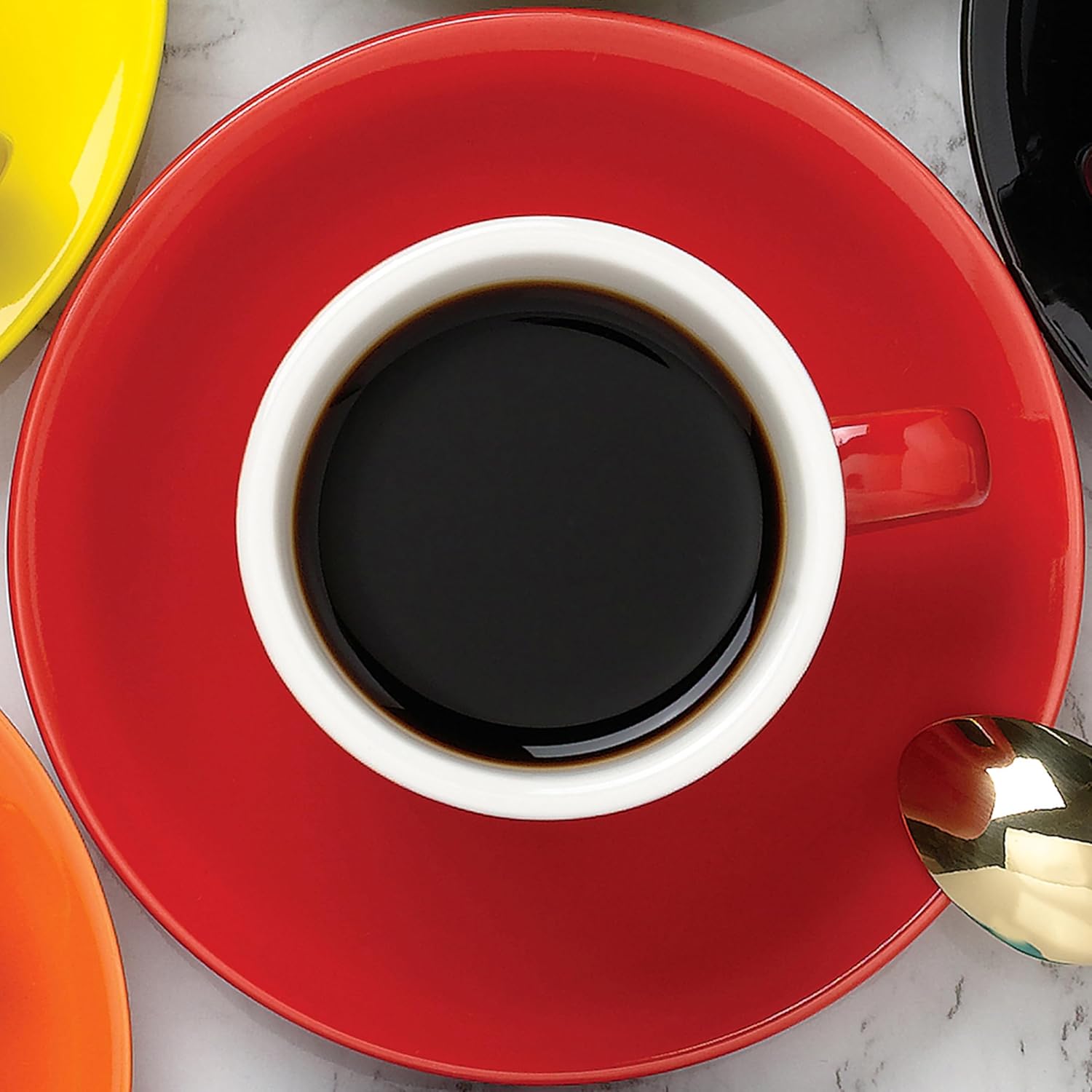 Elevate your espresso experience with this sophisticated set of 6 cups and saucers. Each cup holds 3 ounces of your favorite brew, making them perfect for traditional espresso servings. The striking red exterior contrasts beautifully with the pristine white interior, creating a modern and elegant look for your coffee service. Crafted from high-quality porcelain, these cups provide excellent heat retention while remaining comfortable to hold thanks to their well-designed handles. The matching saucers offer stable support and catch any potential drips, ensuring a clean and refined presentation. Whether you're hosting an after-dinner coffee service or enjoying your morning ritual, this set brings café-style sophistication to your home. The classic design complements any kitchen décor and makes an impressive addition to your entertaining essentials. Each piece is dishwasher safe for convenient cleaning.