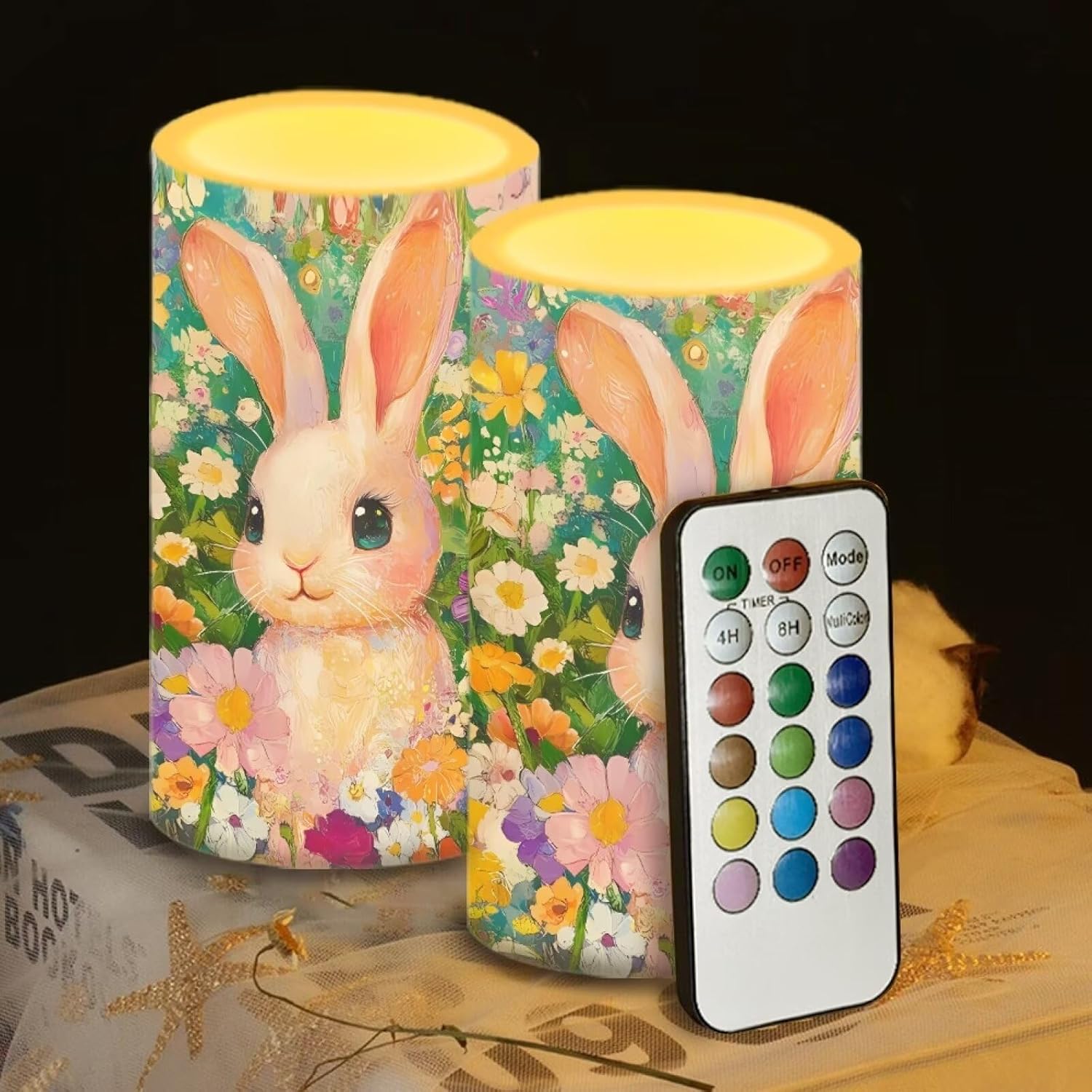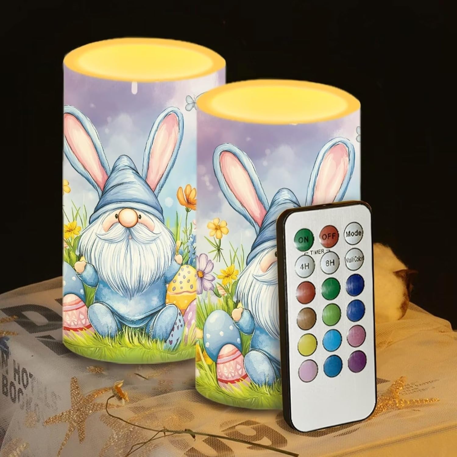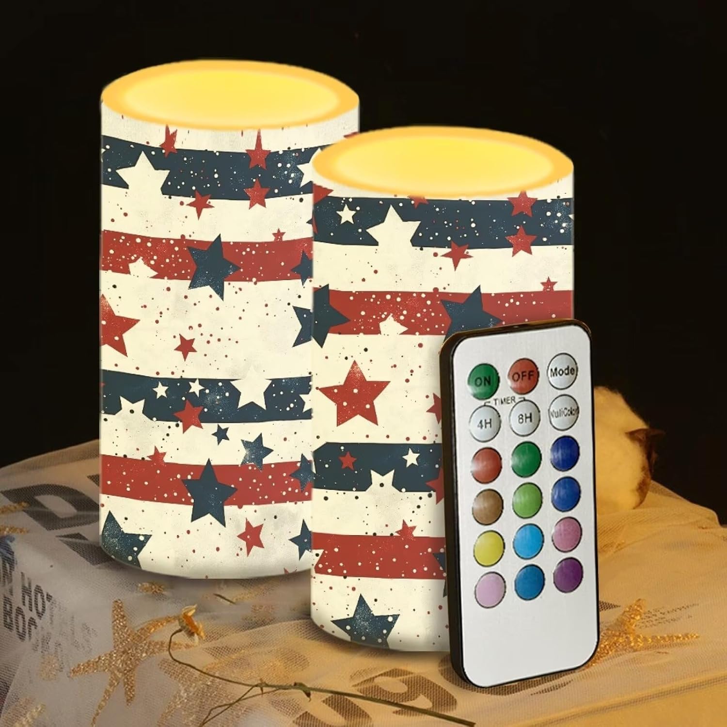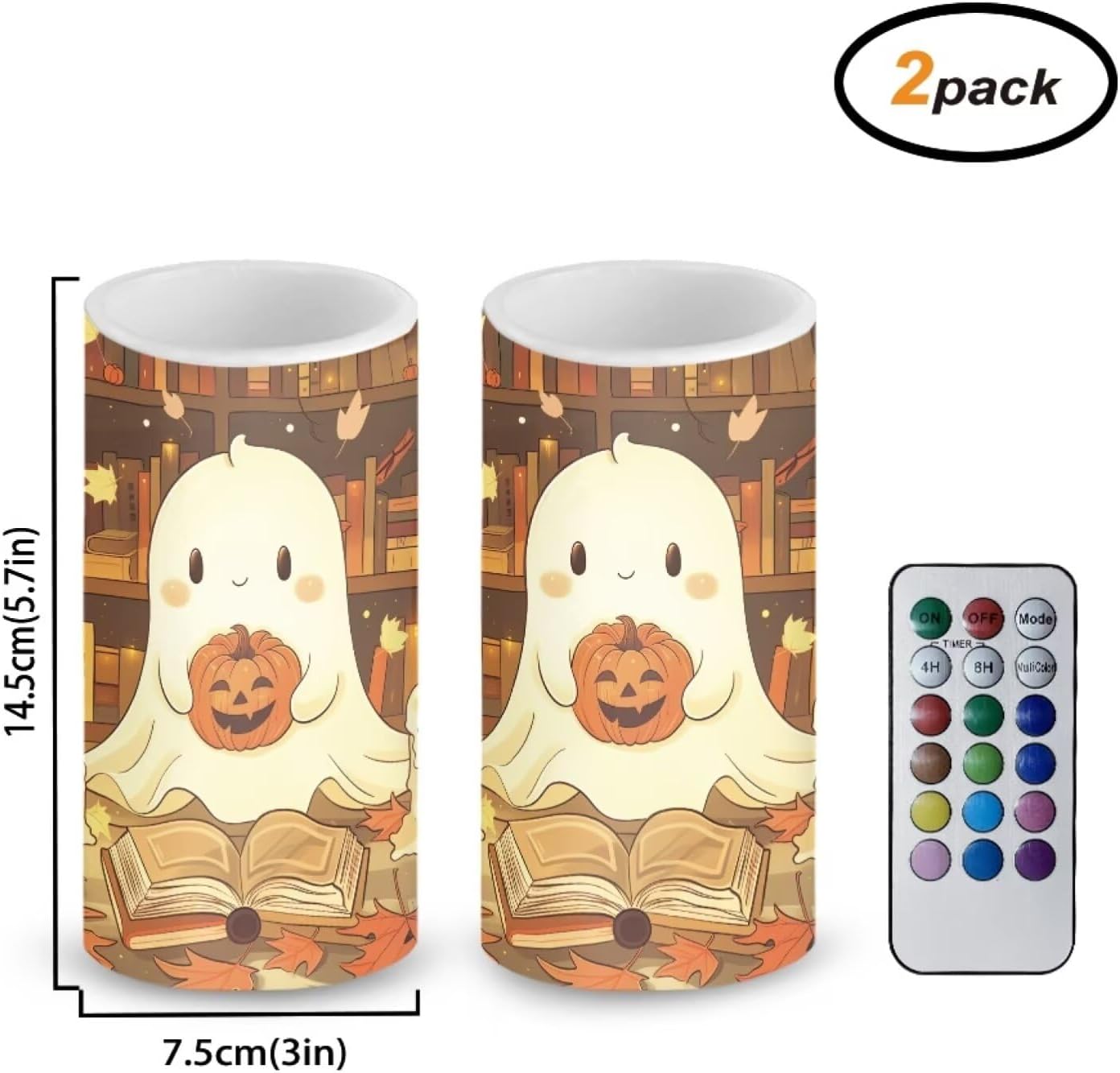 Material: Plastic Size: Diameter 3", Height 5.7" Required battery model: 3 AAA batteries for candle Switch: ON/OFF/Timer Timer: 4 Hours / 8 Hours Package Information: 2 Pcs LED candles flickering + 18-key timing color changing remote Home Decoration: Suitable for Christmas, Halloween, party, weddings, anniversaries, or adding a haunting touch to your dining table, mantels, dining room, bedroom, create the perfect eerie atmosphere.They are also the perfect gift for colleagues, friends and family, not only beautiful and durable, but also don't worry about dripping wax.