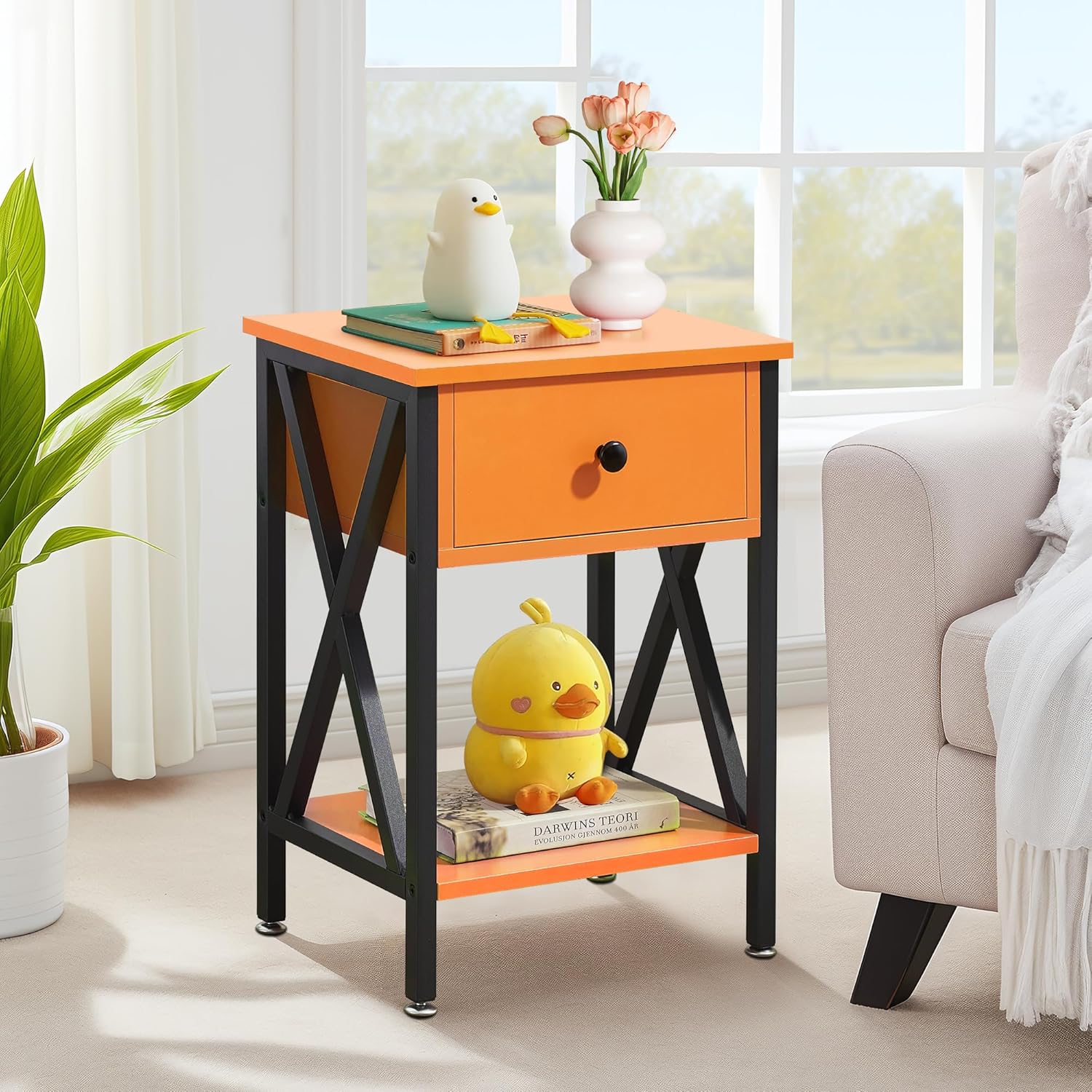 VECELO Nightstand: Tough structure with X-design Featuring light weight and compact design Equipped with adjustable feet Suitable for a variety of decoration styles Friendly Customer-Service Specifications: Color:Orange Dimension: 11. 8" x 15. 8" x 21. 7" Package Includes: 1 x End Table 1 x Instruction 1 x Assembly Kit