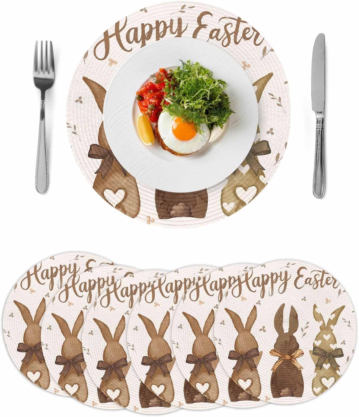 Easter Round Woven Placemats for Indoor Outdoor Seasonal Spring Holiday Dining Table DecorGive an elegant decor touch to your home, and add a natural art aesthetic chic atmosphere.【Product Description】Package: Placemats Set of 2/4/6/8 PCSSize: Diameter 15 InchMaterial: Eco Friendly PolypropyleneMatches delicately and creates a unique lifestyle for your dining table, kitchen, garden, party, banquet, hotel, diner, reception, cafe, bar, picnic, BBQ, patio, any outdoor and indoor use.【Multiple Design Occasions】Adopting advanced digital printing technology, bright colors, and clear images, sturdy weave, overall elegant and beautiful.Our place mats come in a variety of vibrant colors and patterns full of natural aesthetic feeling for you to decorate your home.Our placemats set are durable, reusable, and exquisite. Great choice as a considerate and delicate gift for family members, couples, friends, and roommates.The high end placemats look elegant and stylish, and could be used for cups, plates, some tableware, cooking pots, potted plants etc, to meet your different needs. 【Warm Tips】Wipe clean with damp sponge or cloth. Both machine and hand washable with gentle cycle and lay flat to dry, no bleach, iron on low heat if required. The colors may have slight differences due to different screens.Due to the official package restrictions, placemats rolled up in the box, we suggest put some heavy things on the mats after unboxing, the crease will disappear and it will be flat.【Special Note】How to make the placemats flat?Unboxing → Crease the back → Turn over the placemats opposite → Make the front side up → Put heavy things on it → After a while, they will be flat