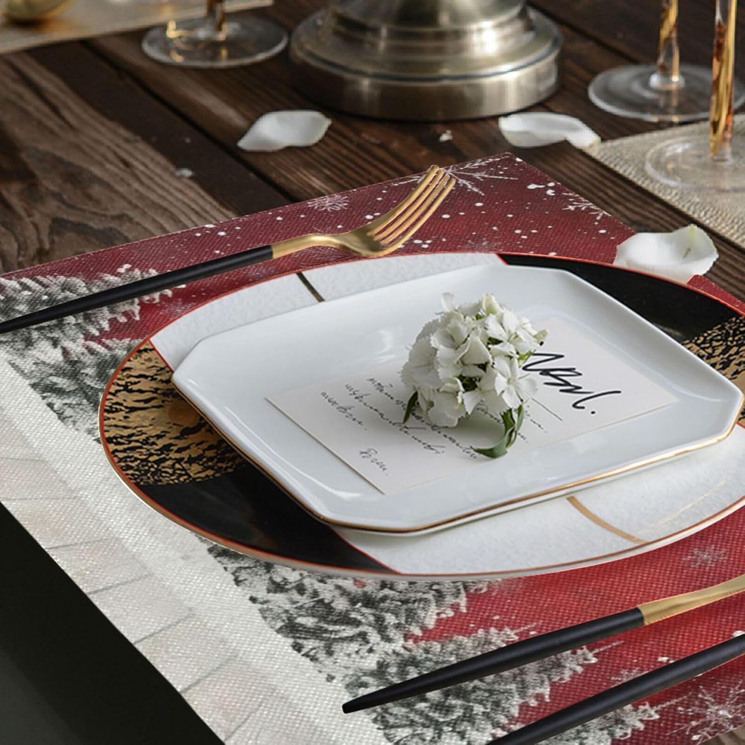 Specification: Material: high quality Polyester Size: 12 X 18 INCHES Package Included: 6 x placemats Features: Protect your dining table The exquisite and elegant table mats not only effectively protect your dinner table from scratches, heat and stains, but also extend the life of your table Slip resistance, non-stick, no fading and heat- resistant The placemats not only can protect your dinner table, but also a stylish decoration for your home, suitable for indoor and outdoor use and every festival Usage range: Perfect for dining tables, coffee tables, storage tables, outdoor picnics, etc. Warm Note: The placemats are washable and easy to clean up. Hand wash in warm water and wipe dry. No machine wash. Easily stored, roll up to store it away, flatten when put out to use