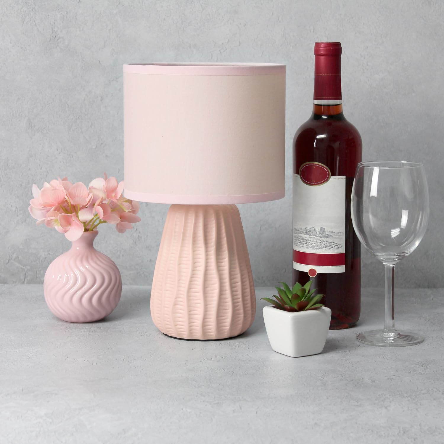 A modern feel to a traditionally styled lamp! This mini ceramic table lamp is textured throughout the painted base, which is available in a number of pastel color options, all with a matching fabric drum shade. At just under a foot tall, this lamp is the perfect accent piece to your living room, bedroom, or child's room!