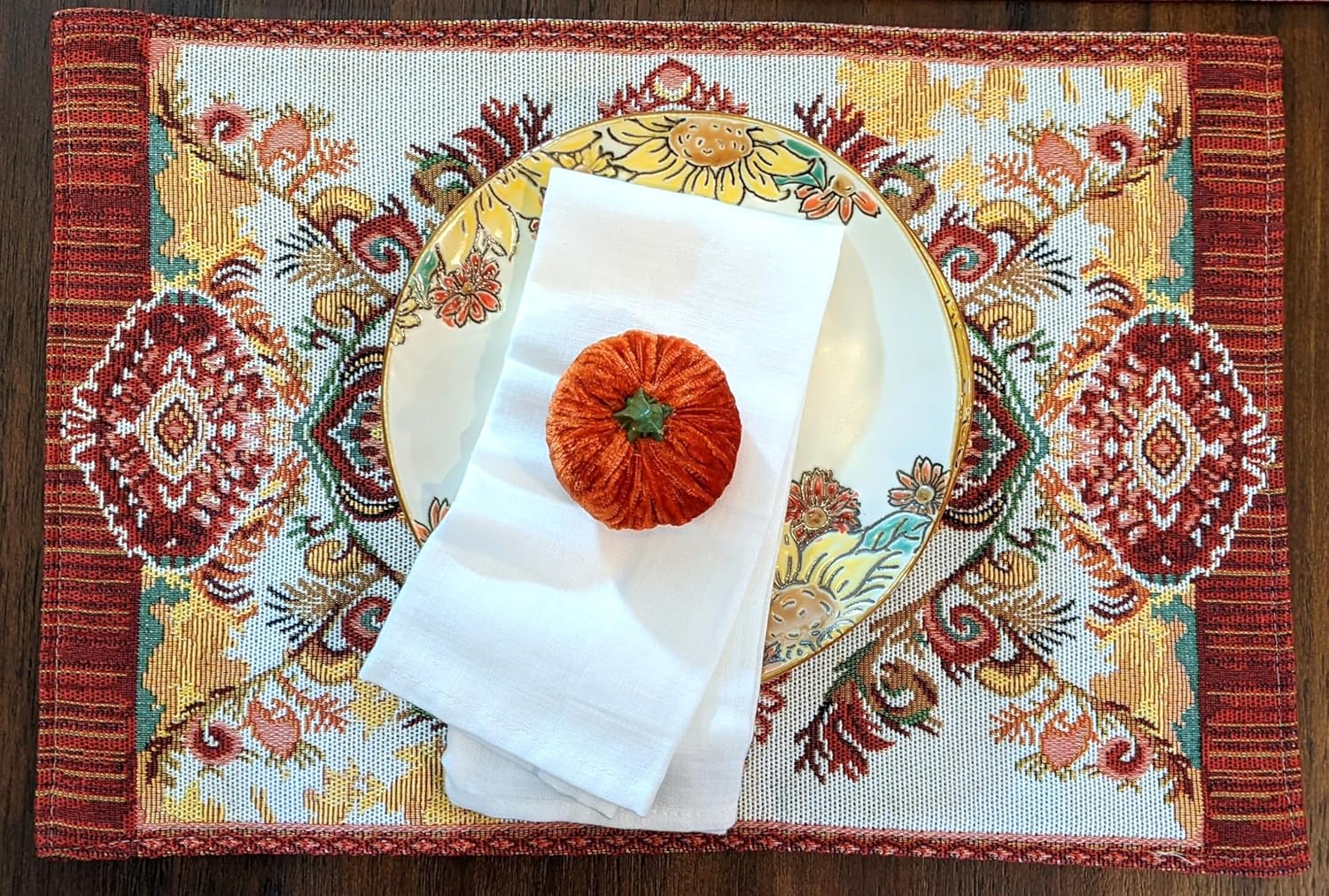 Transform your dining experience with our exquisite Tuscany Rococo Placemats Set. These elegant table mats showcase a stunning multi-color medallion design in rich burgundy, red, orange, yellow, and ivory hues, expertly woven into high-quality cotton linen fabric. Key Features: Set of 4 placemats, each measuring 13"W x 19"L Durable tapestry/needlepoint style construction Intricate paisley and floral patterns Perfect for Fall, Autumn, Thanksgiving, or year-round use Elevate your home decor with these versatile placemats that effortlessly blend rustic charm and sophisticated style. The ornate designs add a festive touch to any kitchen, dining room, or living space, making them ideal for both everyday meals and special occasions. Crafted from sturdy woven cotton linen, these placemats boast a faux needlepoint structure that ensures long-lasting beauty through many seasons. The lightweight yet durable fabric is easy to maintain and adds a touch of elegance to your table settings. Care Instructions: Dry clean or machine wash cold Use mild detergent Tumble dry low or air dry Do not bleach or iron Enhance your dining ambiance and impress your guests with these timeless, decorative placemats. Perfect for holiday gatherings, family dinners, or as a thoughtful housewarming gift. Add a touch of Tuscan-inspired luxury to your home today