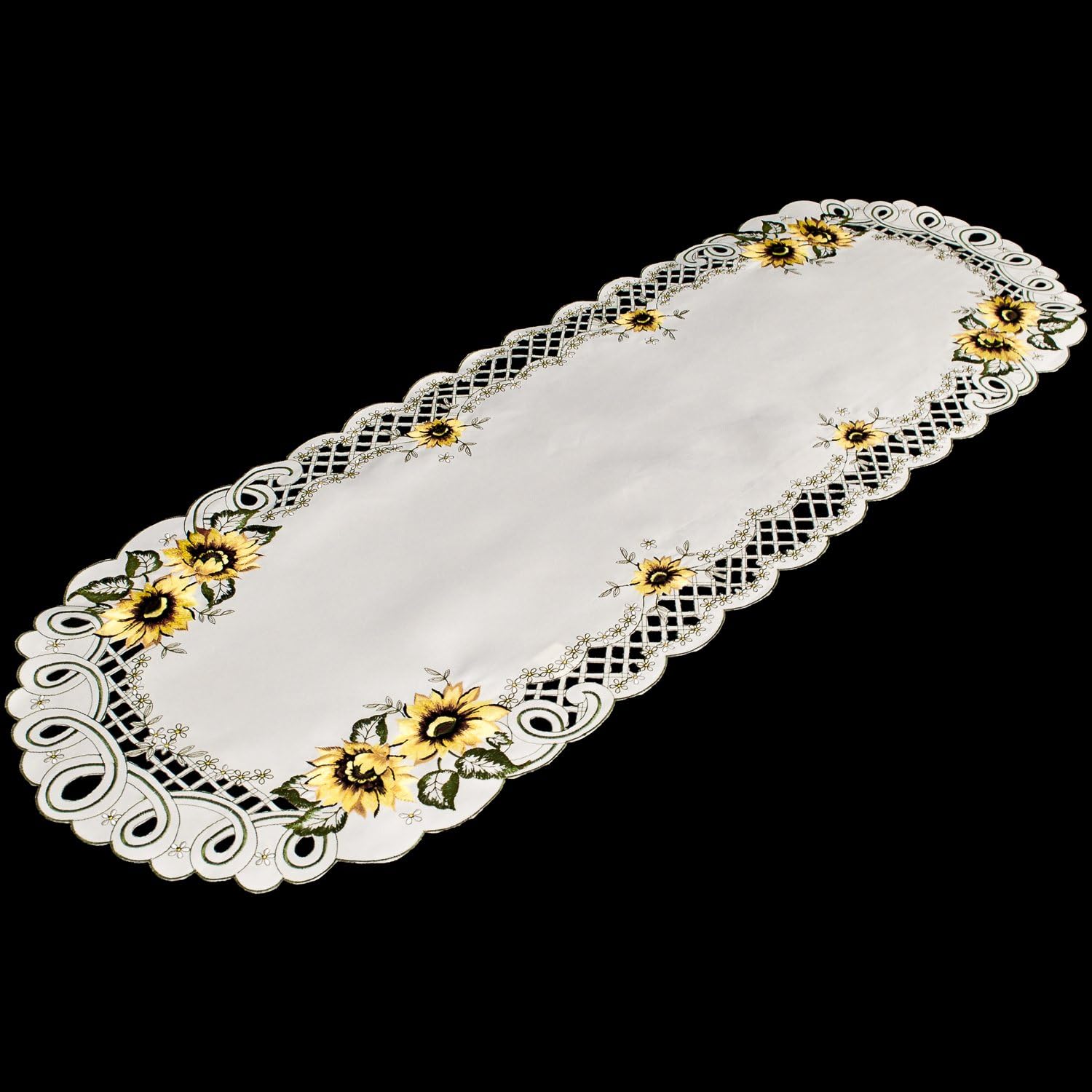 Add a touch of sunshine to your home decor with our Sunflower Classic Runners. These beautifully crafted pieces are designed to bring warmth and elegance to any room. Featuring vibrant sunflower patterns, they are perfect for brightening up your dining table, coffee table, or any surface that could use a splash of color. Made from high-quality materials, these runners and doilies are both durable and stylish, making them a fantastic addition to your home decor collection. Set your table with this beautiful embroidered Sunflower on white Table Runner in shades of yellow, brown, and white on all edges. The Runner comes in 16″ X 54″ oval and is all 100% Polyester machine wash ‘ dry. Sizes may vary with lace patterns. Order and enjoy on your Dining Room or Kitchen Table on a Sofa Table behind your couch or in the bedroom on your single, double, or triple dresser or your nightstand. Many ways to arrange them in your home. Keeps your furniture scratch-free for many years. Click on each picture to enlarge. Also comes in Place Mats. Table Toppers and Table Cloths. ** All sizes may vary with lace pattern from a quarter inch to three-quarters inch.**