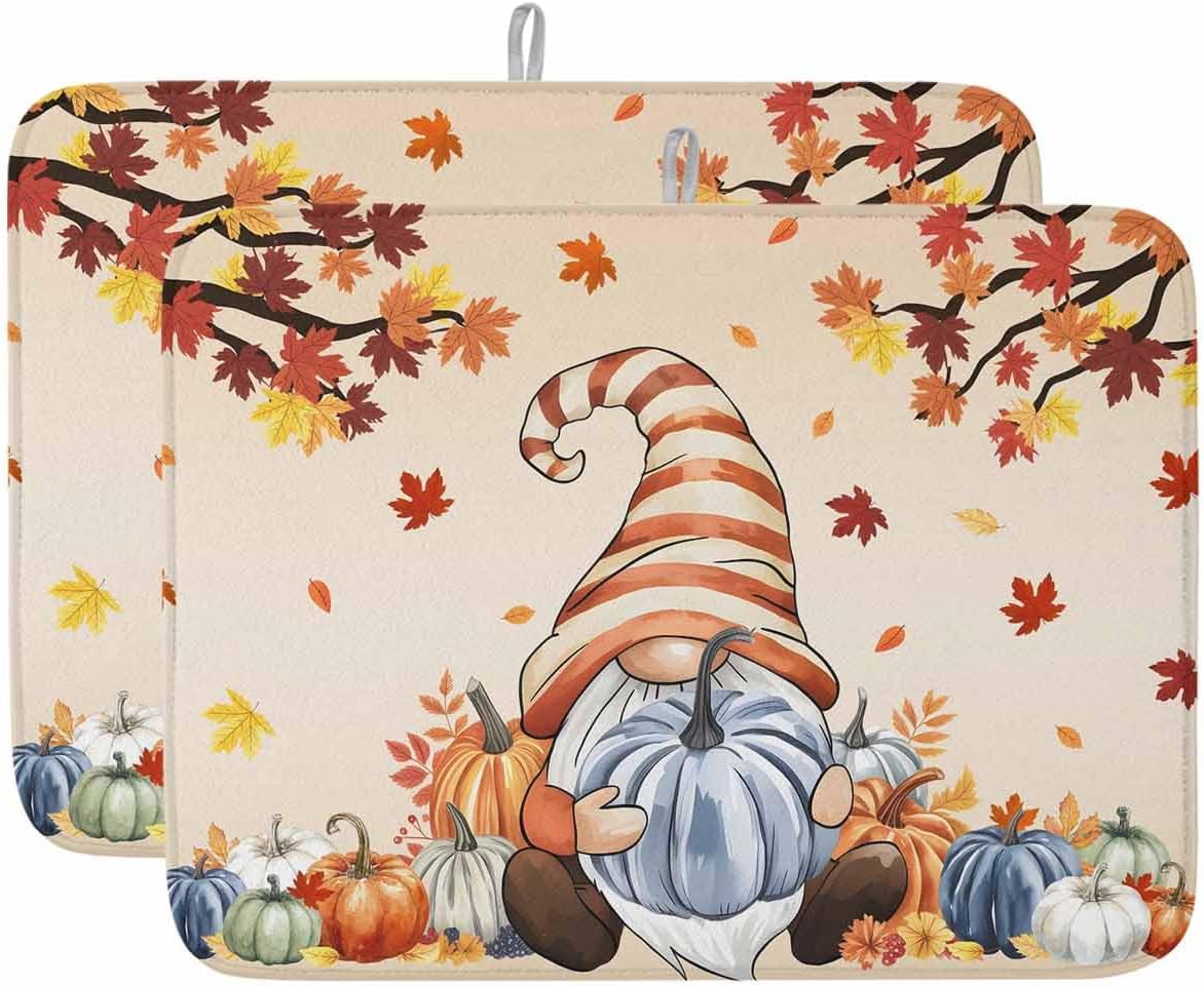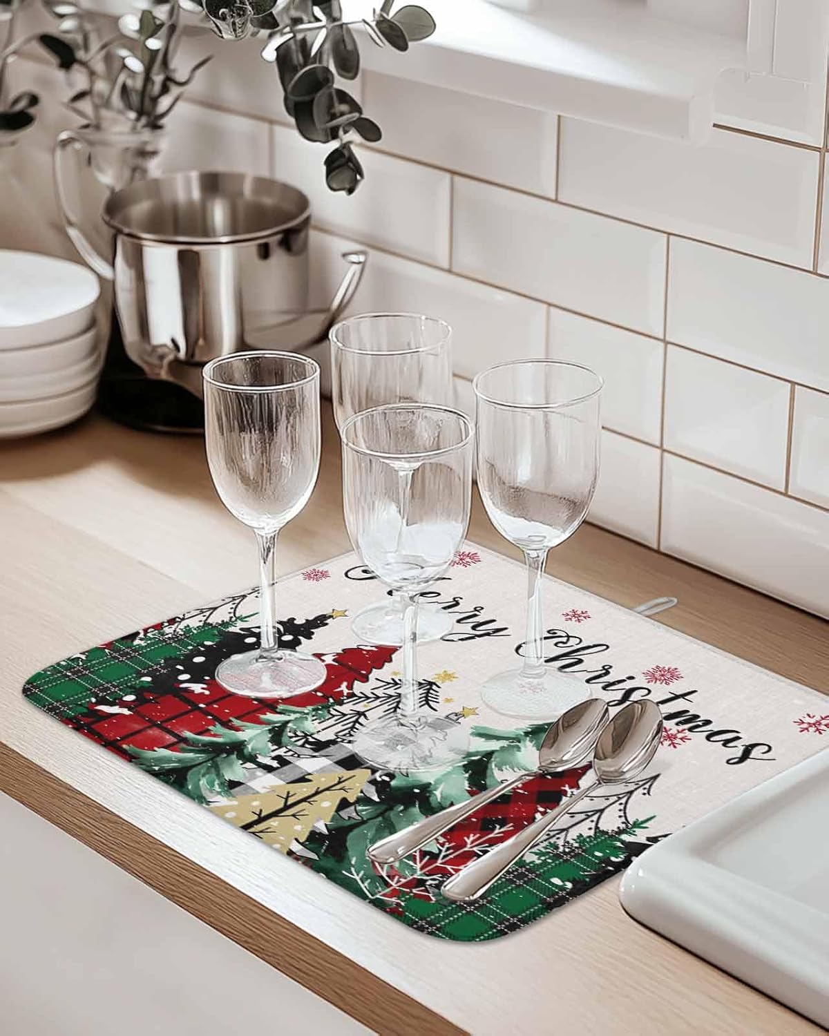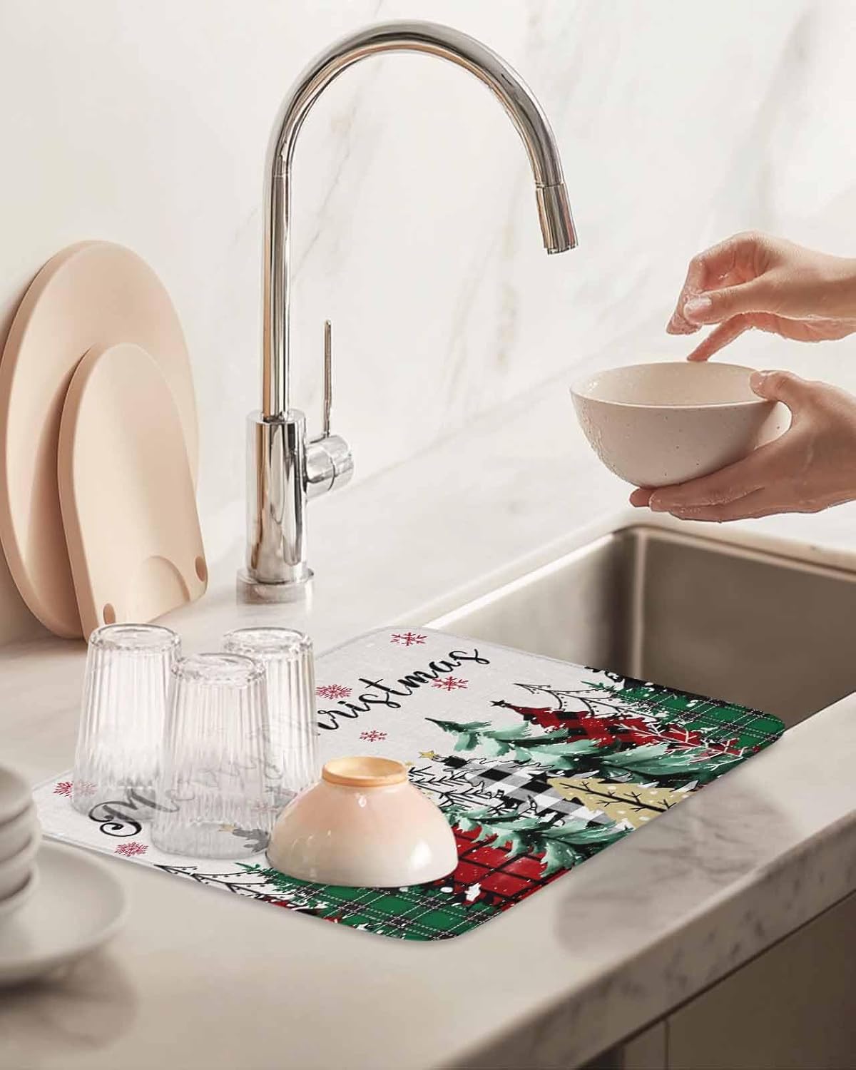 Are you tired of messy kitchen countertops?Are you worried about spilling water all over the place after every wash?Can't find a suitable place to put washed green fruits and vegetables?Our dish drying mats are designed to solve your kitchen problems. It is absorbent, heat insulated, breathable, soft to the touch, easy to clean and store, giving you a clean and tidy countertop. So when you come home from a long day at work, you'll feel refreshed.Material:The surface of dish mat is made of polyester, and mesh bottom. The middle is a thick sponge which is highly absorbent. It can absorbs up to 3 times its weight in water to keep your counters dry.Quick Drying & Storage:The dish drying mat dries quickly, so once your dishes or cookware are complete dry, they can be folded up and stored in any drawer, cabinet, or closet. Or it can be hung without taking up any space.Multipurpose:Our kitchen drying pads are printed on one side, but can be used on both sides. Soft and foldable. It can be used as a protective pad to protect the countertop, tableware. Can be used as placemats, coffee maker mats, shoes mat.