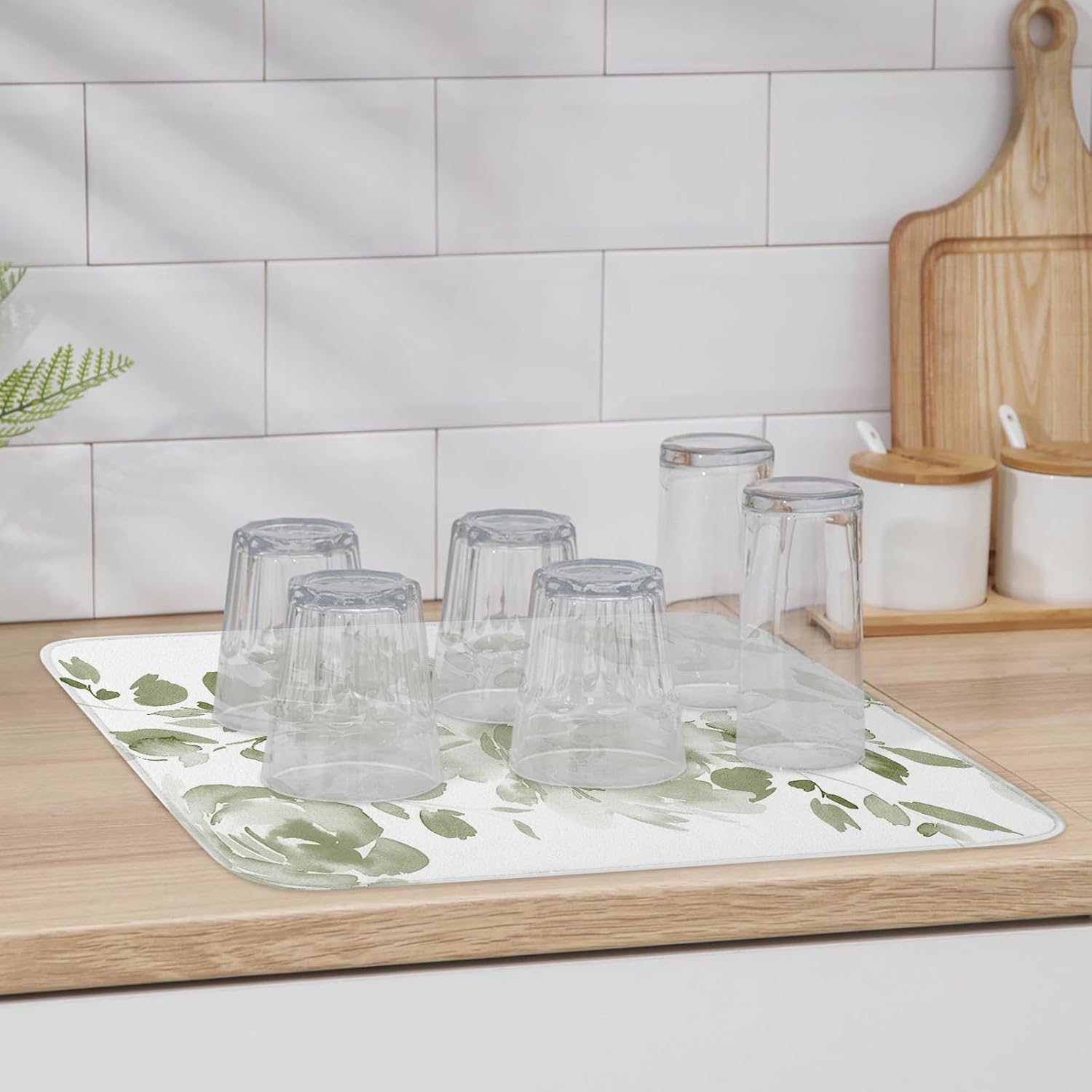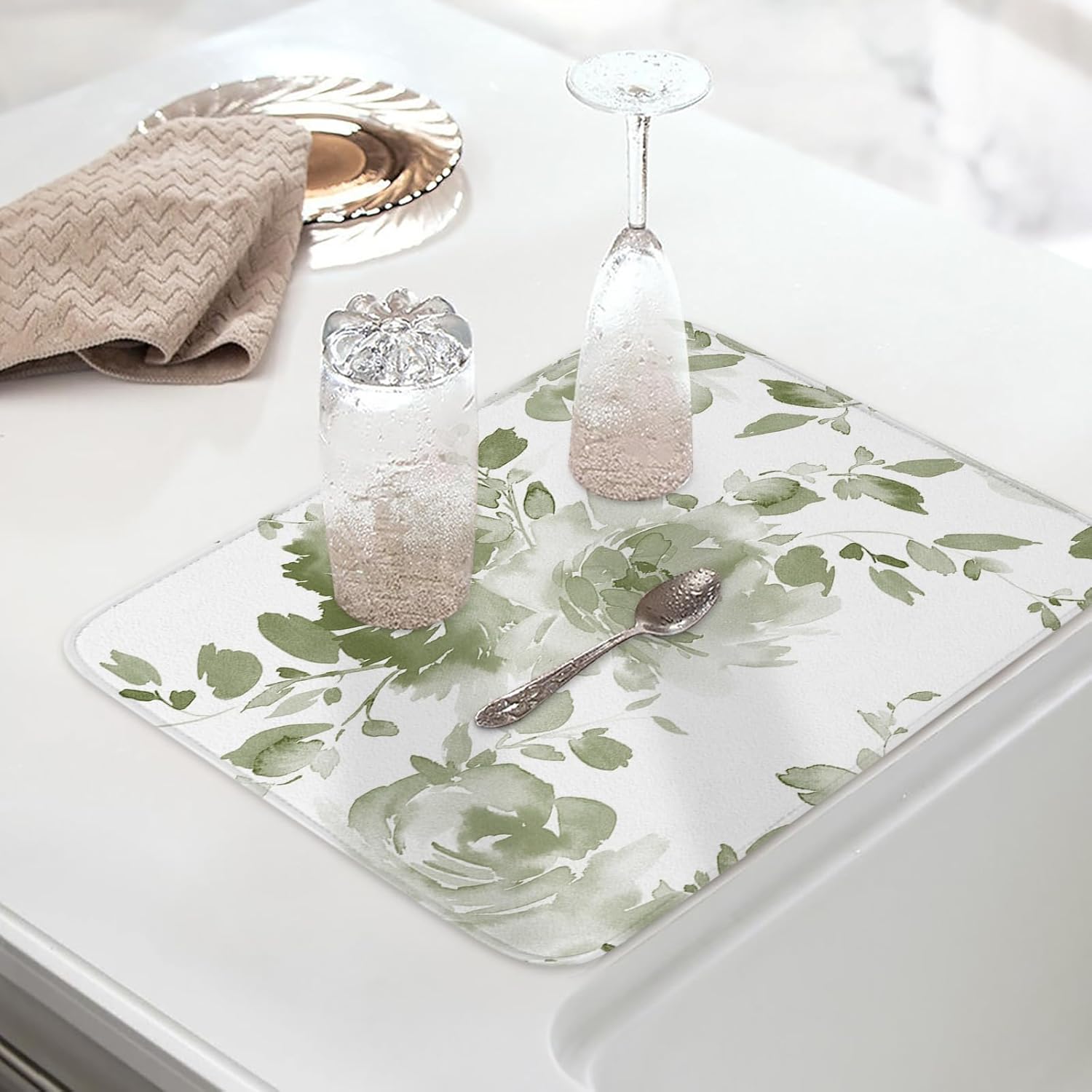Are you tired of messy kitchen countertops?Are you worried about spilling water all over the place after every wash?Can't find a suitable place to put washed green fruits and vegetables?Our dish drying mats are designed to solve your kitchen problems. It is absorbent, heat insulated, breathable, soft to the touch, easy to clean and store, giving you a clean and tidy countertop. So when you come home from a long day at work, you'll feel refreshed.Material:The surface of dish mat is made of polyester, and mesh bottom. The middle is a thick sponge which is highly absorbent. It can absorbs up to 3 times its weight in water to keep your counters dry.Quick Drying & Storage:The dish drying mat dries quickly, so once your dishes or cookware are complete dry, they can be folded up and stored in any drawer, cabinet, or closet. Or it can be hung without taking up any space.Multipurpose:Our kitchen drying pads are printed on one side, but can be used on both sides. Soft and foldable. It can be used as a protective pad to protect the countertop, tableware. Can be used as placemats, coffee maker mats, shoes mat.