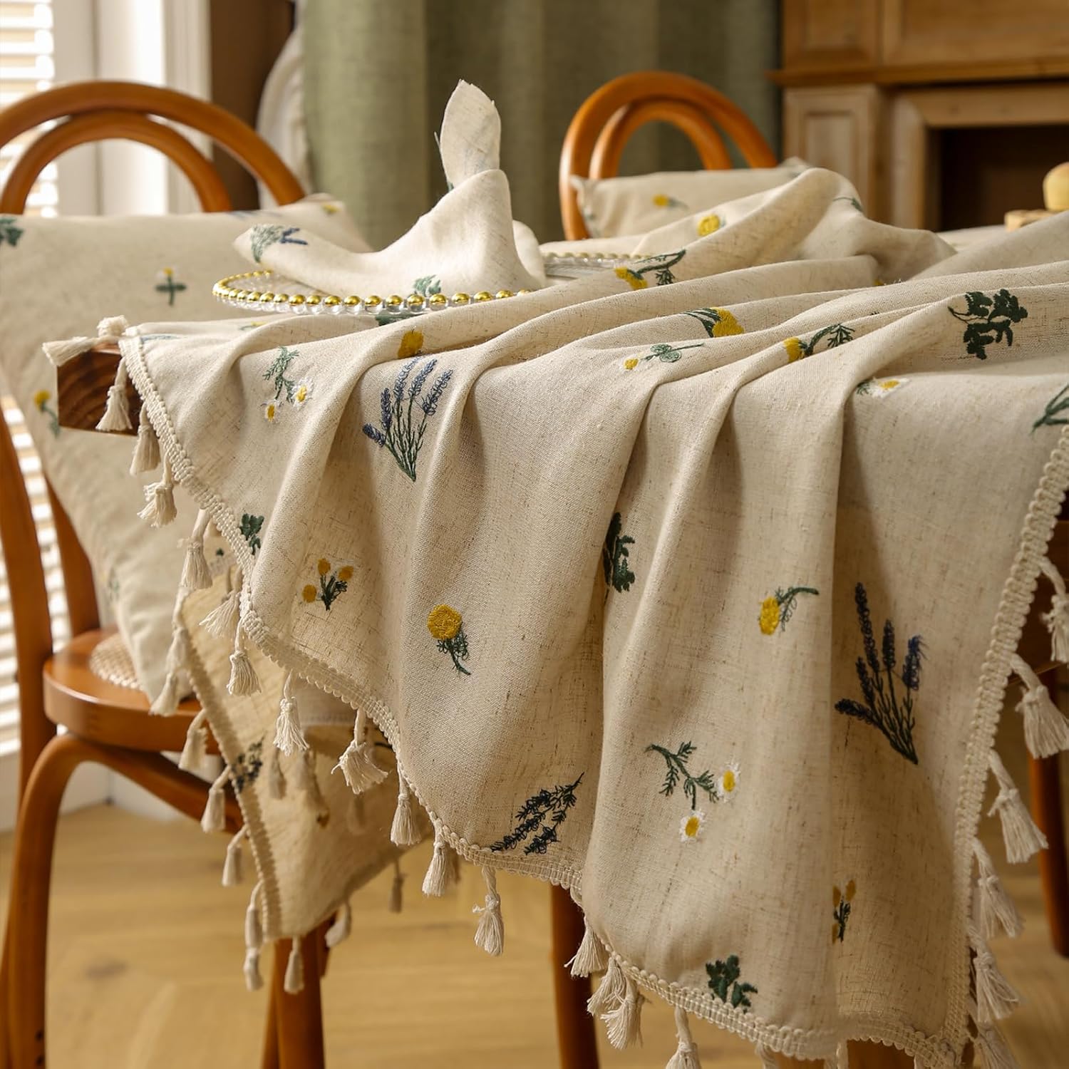 | Additional Features | Daisy Embroidery with Tassels and Spring Tablecloth Design |