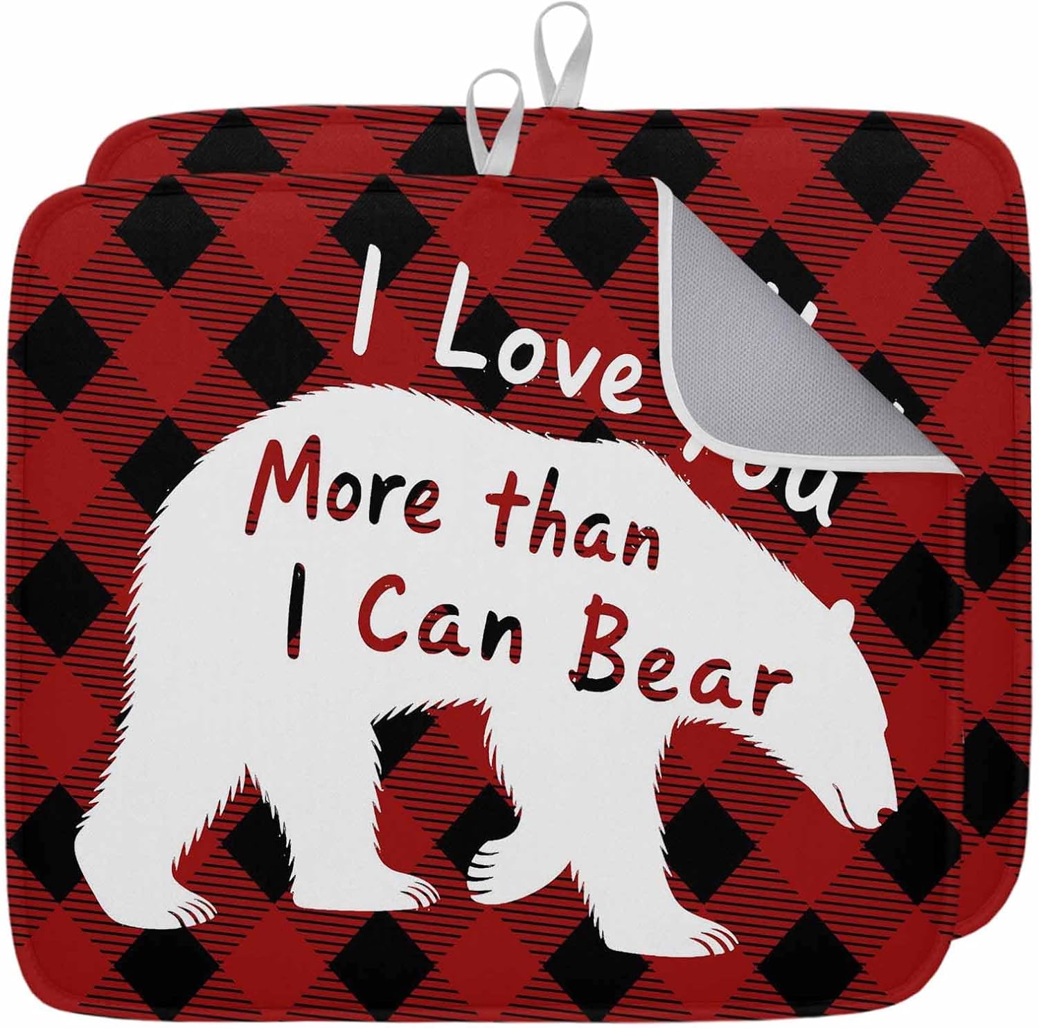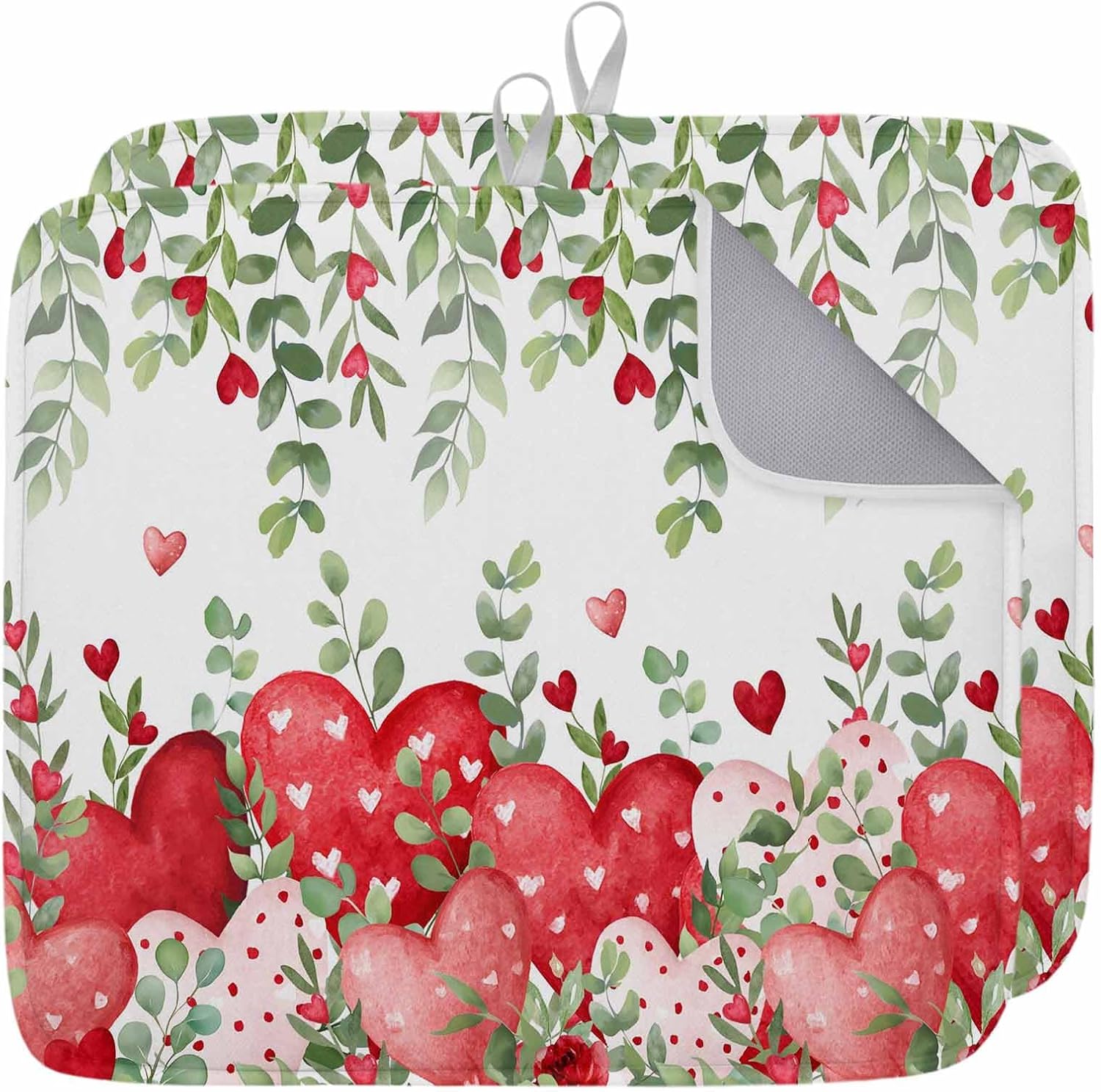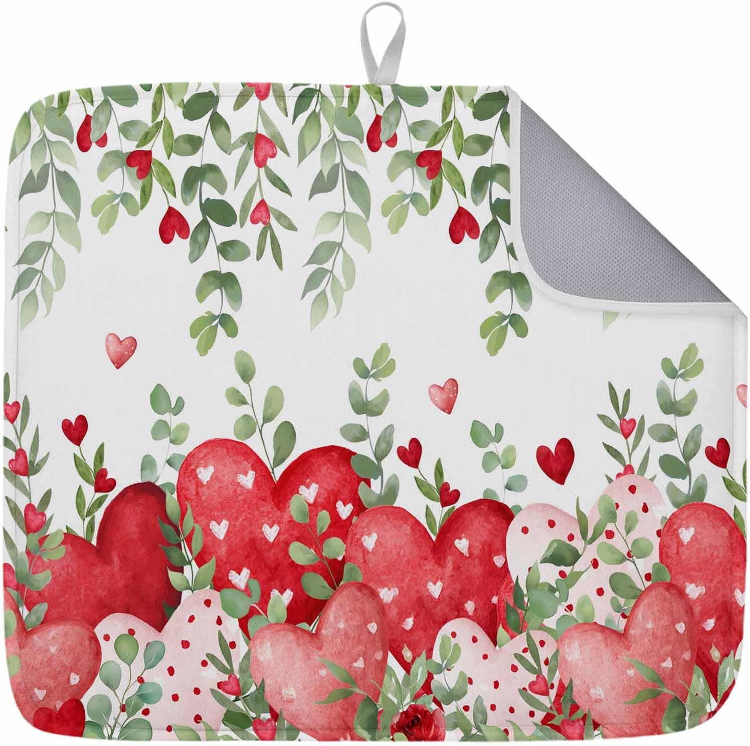 Valentine's Day dish drying mat for counter makes your kitchen more tidy and clean!Bringing you a sense of visual enjoyment a chic vibe and a romantic holiday atmosphere, combining practicality and beauty.Size & Package16 x 18 Inch (Medium) / 18 x 24 Inch (Large).1PC / 2PCSFit most counters, and protect your countertop tables from hot pans or appliances.Microfiber MaterialThe uffer design of the back prevents bowls, glassware and countertops from being scratched or damaged. The back has anti-slip design to prevent the mat slip.Ultra AbsorbencyThe surface of this dish drying mat is made of absorbent microfiber, absorbs 4x its weight in water, and keeps your counter dry.Hanging Loop DesignThe lanyard design can be hung without occupying the space and can be stored and dried. The whole is soft and foldable for easy storage; neatly wrapped, and not easy to fall off.Widely UsedKitchen drying mat for kitchen counter countertop, coffee bar, dish drain rack, great for air drying dishes, glasses, silverware, pots, pans. The bar mats for coffee station is not only a coffee bar accessory but also can be used as dish drying mats, cutlery rack mats, pet feeding mats, door mats, bar mat and bathroom drying mat.Clean & CareMachine Washable. Throw it in the washing machine with cold water and mild detergent, use the dryer, or hang it up to dry.Warm TipsPlease allow a 1-2 cm error due to manual measurement.The colors of pictures and objects may be off due to differences in the monitor.