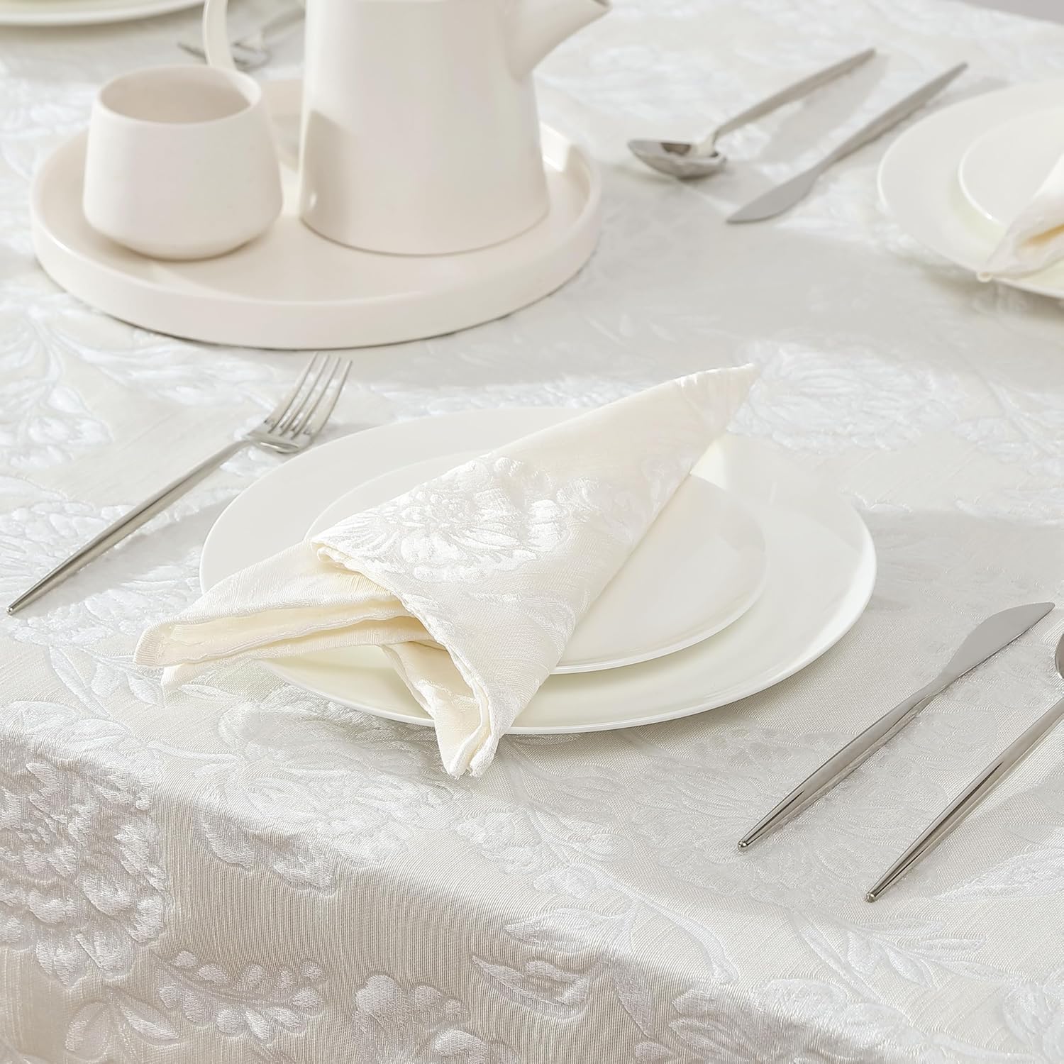 Our Annaleigh tablecloth is both elegant and timeless combining luxurious jacquard fabric with the durability and practicality of polyester. The pretty floral design and neutral colors effortlessly complement any dinnerware, china or table setting, whether it's a formal dinner party or a casual family gathering. Elevate your dining experience with this lovely and versatile tablecloth. Made from high-quality jacquard fabric our tablecloth offers both sophistication and functionality. The fabric is resistant to wrinkles, ensuring a polished look that lays flat on your table. Additionally, it is easy to clean and maintain, making it perfect for everyday use or special occasions. Simply machine wash and tumble dry, and it's ready to impress your guests again and again. Perfect fit for your rectangular table. The generous dimensions provide full coverage, protecting your table from spills and scratches while creating an inviting atmosphere that showcases your impeccable taste in home decor. Use for formal or casual dining, for every day, celebrations, events, birthdays, anniversaries, or holidays. Seats 10-12.