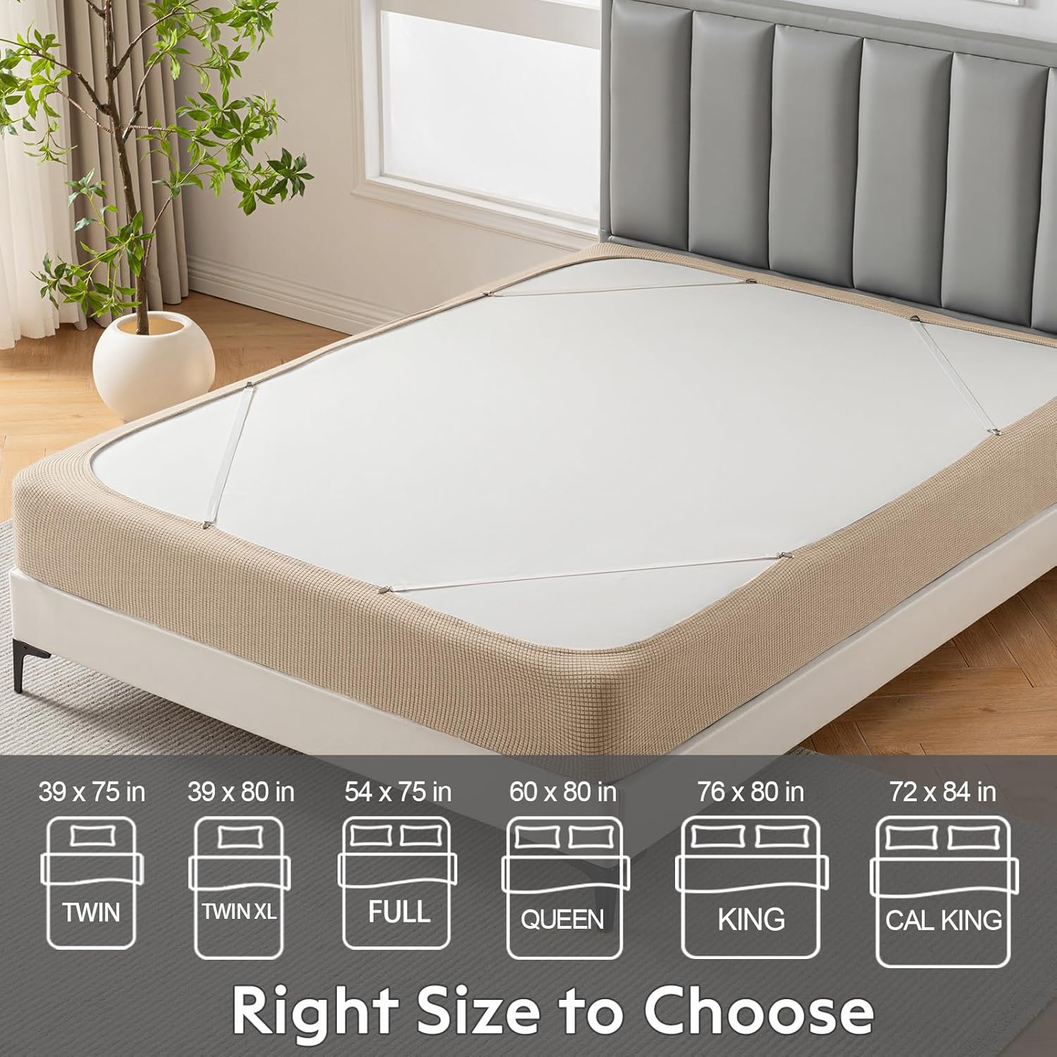 MIYE Jacquard Box Spring Cover Heavyweight jacquard fabric combines durability with a luxe finish, effortlessly wrapping box springs (4"-9" height). Four quick-snap elastic straps secure corners in seconds – no tools or adjustments needed. The thick, wrinkle-resistant material hides dust and imperfections while maintaining crisp, tailored lines.