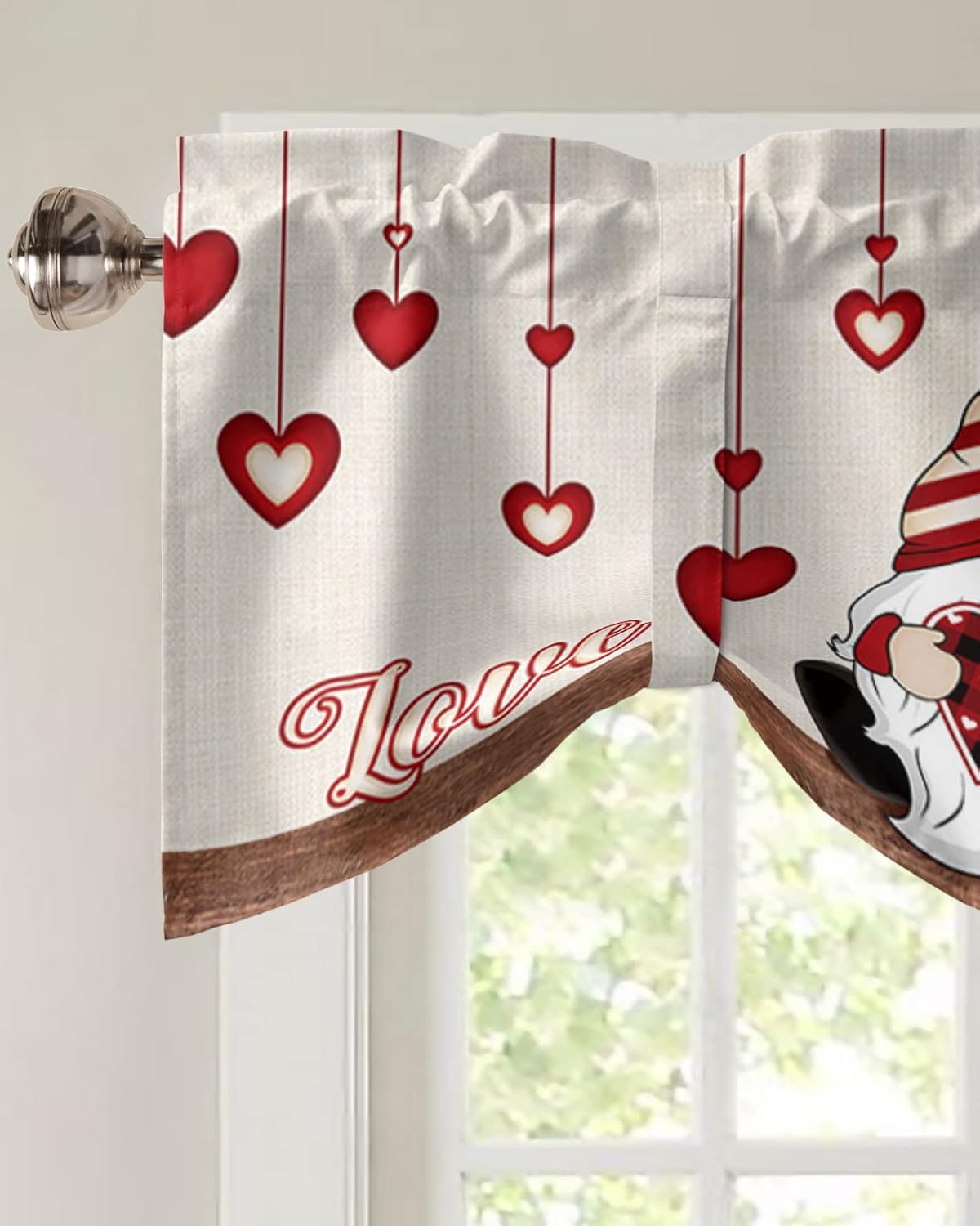 YESOF66 Valentine's Day Gnome Valance Curtain Adds a Beauty and Life To Your FamilyHalf window curtain can add lively atmosphere for home.Unique pattern design it's a perfect gift for your family or friends as holidaySuitable for Multiple Scenarios:Home, Farmhouse, Kitchen, Living room, Bedroom, Bathroom, Dining room, Door head, Office, Closet, Laundry room, Studio, Basement, Cafe and more places you can find. It is also a perfect gift for holiday, like Thanksgiving DayCurtain Valance:1" Header, 3" Rod Pocket,two magic strap on the strap,two shapes can be freely switched to meet your needs for decoration and lightingUnique Design:Unique valentine pattern Be Mine Love gnome couple holding heart and roseMaterial:Made of polyester fabric, the image is clear, there is no odor, and it is not easy to fadeSize Available:54 x 18 inches42 x 12 inches42 x 18 inches60 x 18 inchesCare Instructions:Machine wash cold in a laundry mesh bag, with similar colors, gentle cycle. Use only non-chlorine bleach when needed.Tumble dry low, light iron if needed.Caring for this Vintage Flower Room Darkening Valance is very easy. Just be sure to follow all instructions aboveNotes:Manual measurement, please allow slight errors on size. please confirm the size you need before purchasingThe color may exist a slight difference due to different screen displays