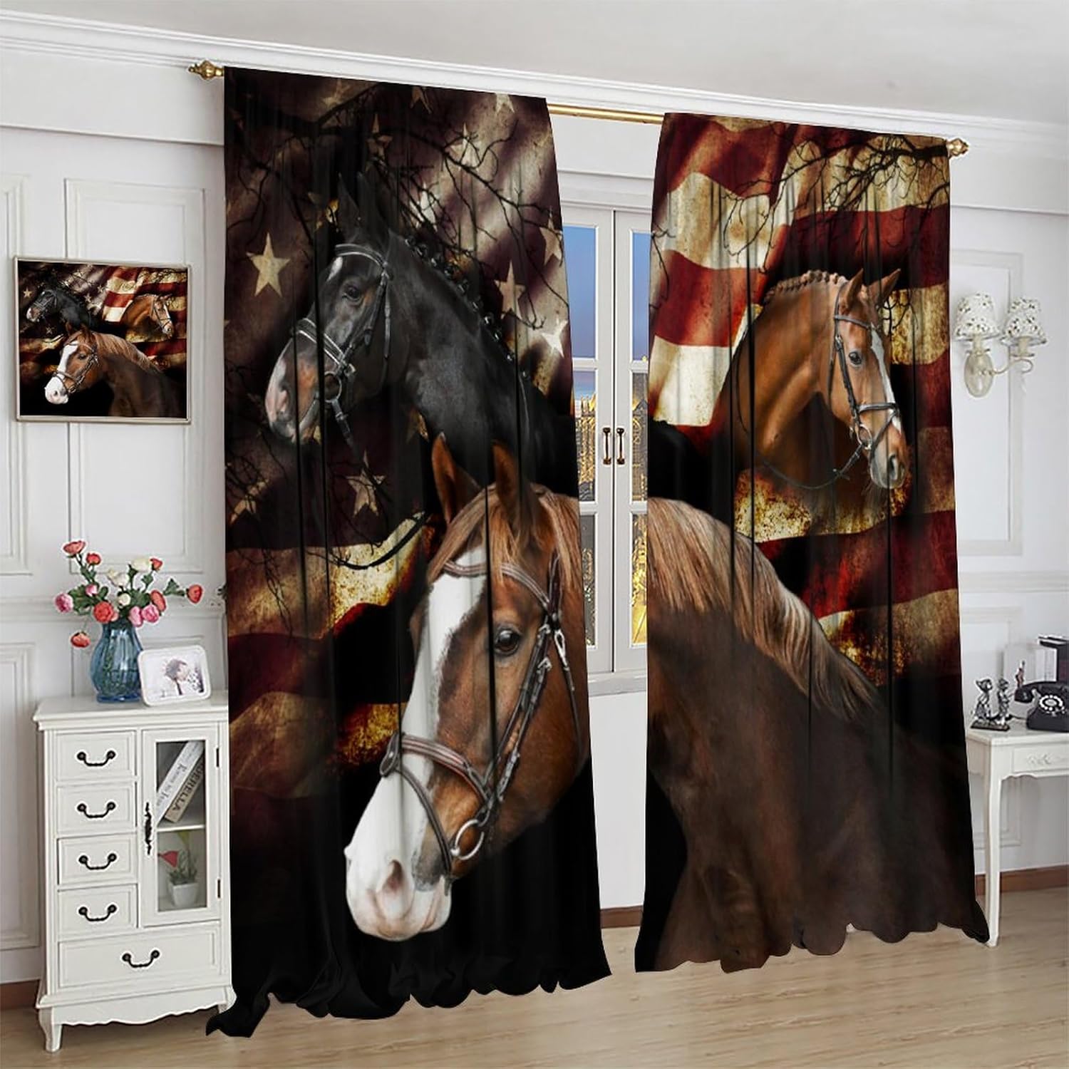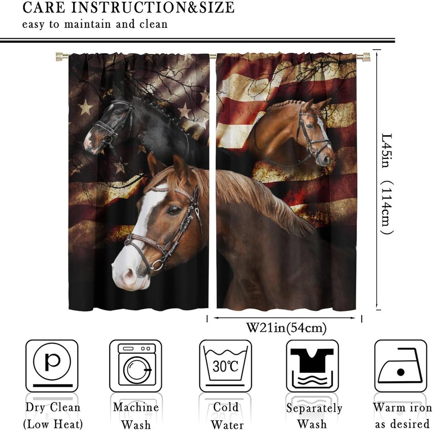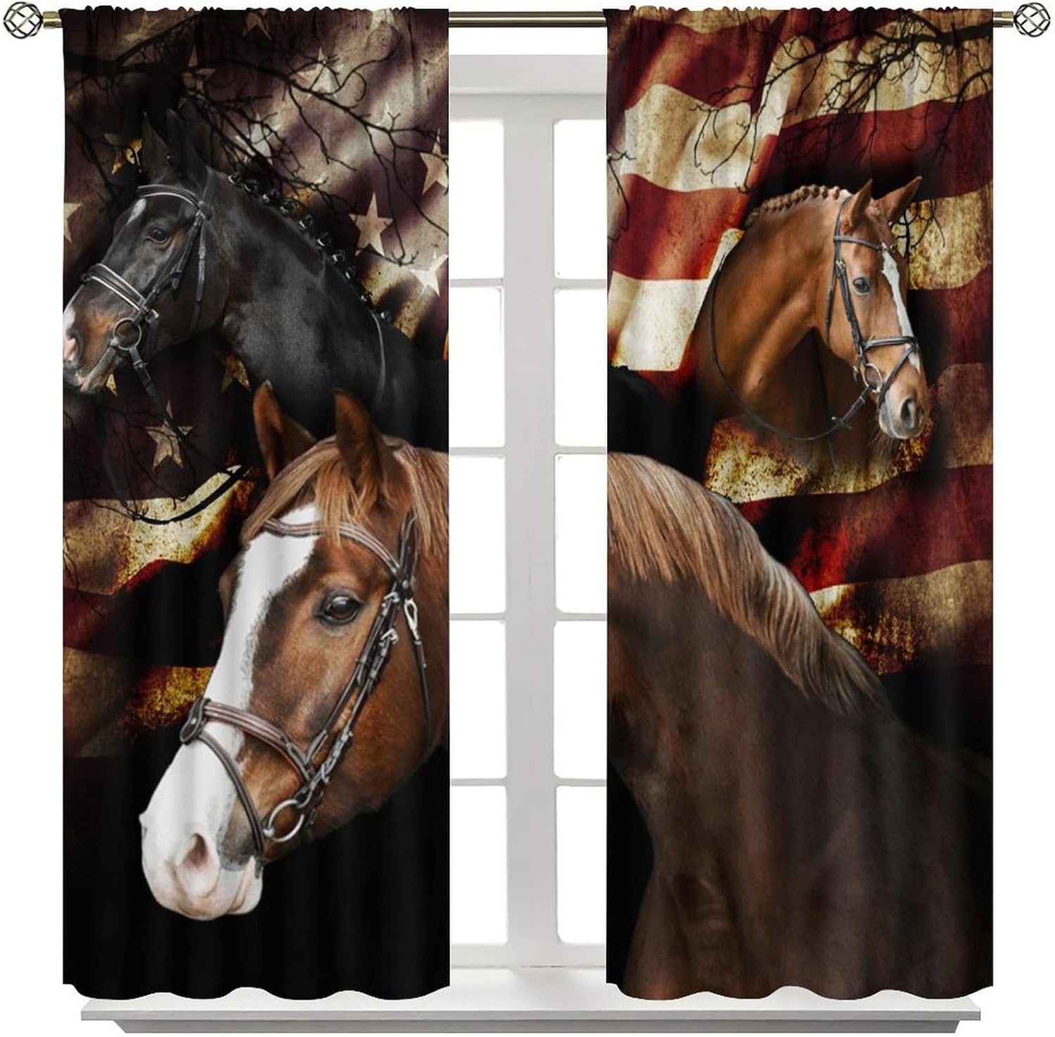 brebasf Rustic Western Horses Patterned Blackout Curtains Comes in eight sizes: Total size: 45" L × 42" W (114cm × 107cm),Includes two pieces, each of which measures:45" length × 21" width (114cm × 53.5cm). Total size: 54" L × 42" W (137cm × 107cm),Includes two pieces, each of which measures:54" length × 21" width (68.5cm × 53.5cm). Total size: 63" L × 42" W (160cm × 107cm),Includes two pieces, each of which measures:63" length × 21" width (160cm × 53.5cm). Total size: 63" L × 55" W (160cm × 140cm),Includes two pieces, each of which measures:63" length × 27.5" width (160cm × 70cm). Total size: 63" L × 63" W (160cm × 160cm),Includes two pieces, each of which measures:63" length × 31.5" width (160cm × 80cm). Total size: 72" L × 63" W (183cm × 160cm),Includes two pieces, each of which measures:72" length × 31.5" width (183cm × 80cm). Total size: 63" L × 72" W (160cm × 183cm),Includes two pieces, each of which measures:63" length × 36" width (160cm × 91.5cm). Total size: 84" L × 84" W (214cm × 214cm),Includes two pieces, each of which measures:84" length × 42" width (214cm × 107cm). This Vintage Western Farmhouse Animal Horses American Flag Curtains liven up your indoor or outdoor spaces with a sense of airiness and beauty.Function: 1. Made of durable polyester fiber,soft and light. 2 The package includes: 2 panels. Curtain material: 98% polyester fiber. Provide a beautiful appearance for your bedroom,living room or office. 3. The curtains are grommet,which can be used with any standard curtain rods. Our products can be used as living,room curtains. Mother's Day,Christmas,Halloween,Thanksgiving,New Year's party decorations at home! We believe that you will like this curtain as much as we do. If you are not satisfied with our products,please contact us,we will solve any problems encountered by the products for you,so that you are satisf