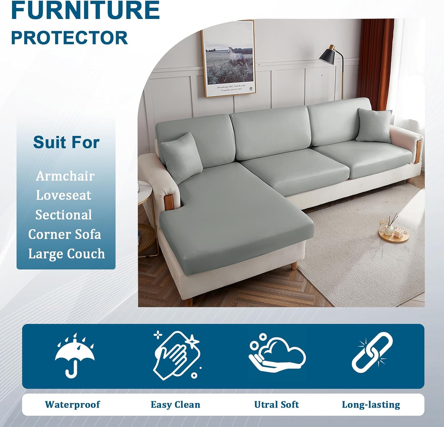This waterproof sofa seat cushion cover is suitable for most shapes of cushions, dust-proof, stain resistant, scratch resistant, and graffiti resistant, perfect for families with pets and children! SIZE: ( Each size only includes 1 seat cushion cover ) Width: distance between left side to right side Depth: distance between front to back Thick: distance between bottom to top Width 50-63 cm/20-25 in, Depth 50-65 cm/20-25 in, Thick 5-20 cm/2-8 in Width 100-125 cm/39-49 in, Depth 50-65 cm/20-25 in, Thick 5-20 cm/2-8 in Width 150-190 cm/59-75 in, Depth 50-65 cm/20-25 in, Thick 5-20 cm/2-8 in Width 65-80 cm/25-31 in, Depth 65-80 cm/25-31 in, Thick 5-20 cm/2-8 in Width 85-110 cm/33-43 in, Depth 65-80 cm/25-31 in, Thick 5-20 cm/2-8 in Width 120-150 cm/47-59 in, Depth 65-80 cm/25-31 in, Thick 5-20 cm/2-8 in Width 155-175 cm/61-69 in, Depth 65-80 cm/25-31 in, Thick 5-20 cm/2-8 in Width 65-95 cm/25-37 in, Depth 70-95 cm/28-37 in, Thick 5-20 cm/2-8 in Width 95-135 cm/37-53 in, Depth 70-95 cm/28-37 in, Thick 5-20 cm/2-8 in Width 135-160 cm/53-63 in, Depth 70-95 cm/28-37 in, Thick 5-20 cm/2-8 in Width 165-195 cm/65-77 in, Depth 70-95 cm/28-37 in, Thick 5-20 cm/2-8 in Width 150-170 cm/59-67 in, Depth 90-100 cm/35-39 in, Thick 5-20 cm/2-8 in Width 160-190 cm/63-75 in, Depth 95-110 cm/37-43 in, Thick 5-20 cm/2-8 in Width 60-85 cm/23-33 in, Depth 30-50 cm/12-20 in, Thick 5-20 cm/2-8 in Pillowcase: Width 45 cm/18 in, Length 45 cm/18 in