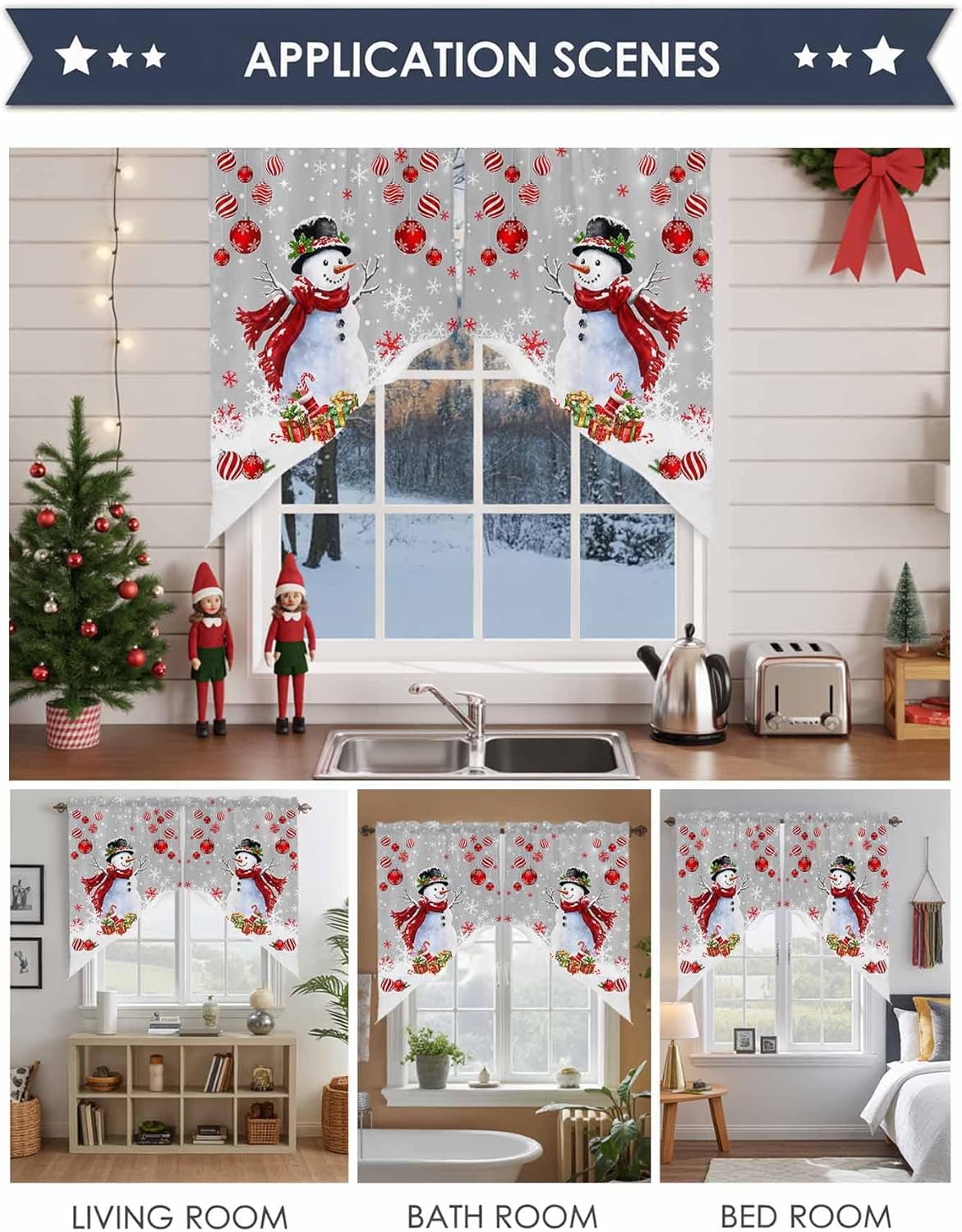 Christmas Swag Curtains Valance Scalloped Valance Swags for Living Room, Christmas Short Swag Topper for Small Windows Material: Polyester Size: 28"x36", 36"x36", 36"x45" Package Includes: 2 Pair Swag Curtains Features: High Quality Material: Made from premium fabric, these snowman curtains are durable, lightweight, and easy to maintain. Exquisite and Elegant Design: These snowman present swag valance curtains feature a Christmas scalloped window treatment design, adding a touch of elegant and fashionable to home decor living room or kitchen space. Installation: The rod pocket design allows for quick and tool-free installation, transforming your room instantly. Applicable Occasions: These winter snowman swag window curtains are not only perfect for kitchen windows but also ideal for living rooms, dining rooms, or any other areas. These snowman snowflaks swag curtains can be paired with different curtain styles and decorations. Light Filtering and Privacy: The snowman with red scarf curtains swags provide just the right amount of light filtering, creating a cozy ambience while ensuring privacy. Great Gifts: Our Christmas snowman swag curtain valance is a good choice gifts for Christmas, New Year, Winter Holiday, Housewarming Party, etc. Notes: 1. Washing Instruction: Christmas snowflaks kitchen curtains valance tiers can be washed by hands or machine. Do not bleach. 2. If you have any problems about our products, please don’t hesitate to contact us! We will reply to you within 24 hours and make sure your issues are well answered.