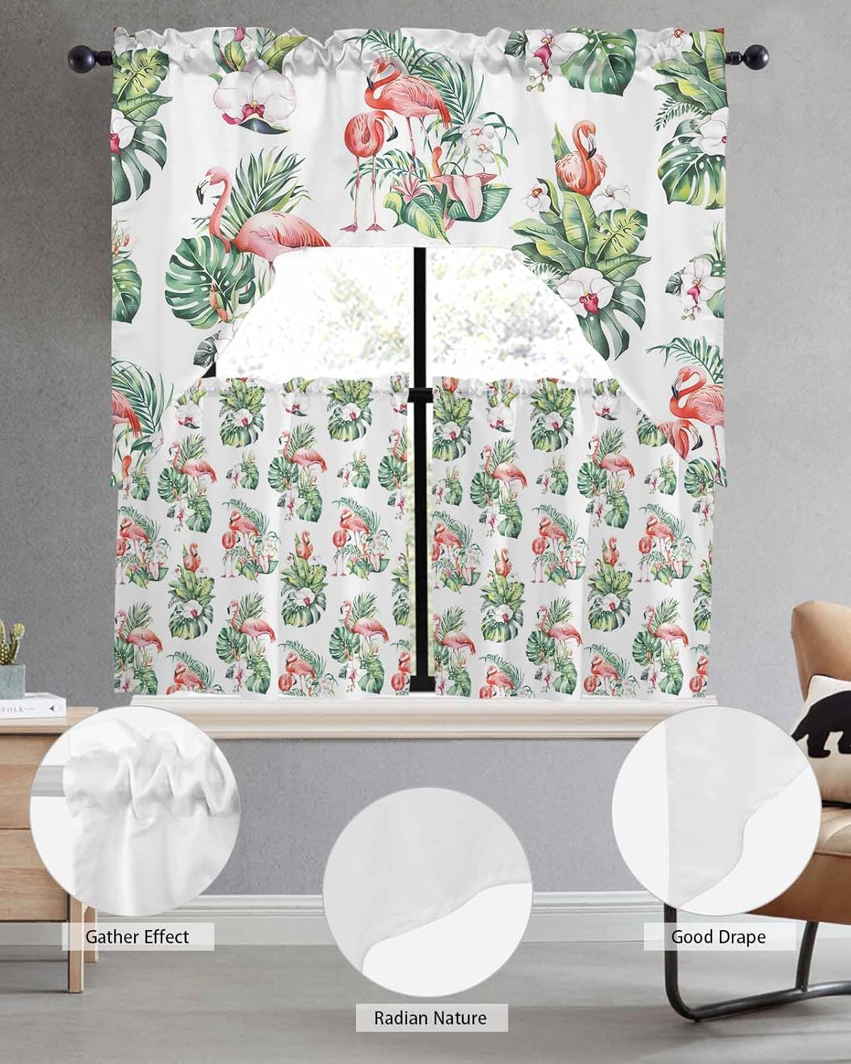 Energy saving! Nice design! What else does an elegant curtain set offer? Used on lower/upper sections of windows, or used alone on shorter lengths of windows, to help block or block light. Providing you with the necessary privacy without losing light, protecting your interior furniture and rugs from direct morning sunlight. Very suitable for shading need of life, it has shading, heat insulation uv protection.Beautiful printed kitchen curtain set with swag valance will make any window in your home the center of attraction. You can choose the 3 piece set which includes 2 tiers and 1 valance for windows or just the swag valance to decorate the top of your window. Features - 3-inch rod pocket. Decorative window cover set for home and small windows. Interior Decoration - cortinas para cocina suitable for kitchen, café, sink, basement, bedroom, laundry rooms and bathrooms. Can also be used in closets and shelves. Easy to Use - Machine washable in cold water, gentle cycle and hang to dry. No shrinkage, no color loss, no wrinkles. Show your personality and make a statement with your kitchen decor! Kitchen swag curtains tier and valance sets serve multiple functions. They increase the visual appeal of a room, add privacy, and screen out natural light. The best technique to prevent light from hitting the glass when working in the kitchen is to use high-quality curtains that match your decor. We use a variety of sewing techniques to ensure seams stay in place, corners are crisp, and miters are well mitered. Upgrade your kitchen decor with this cute kitchen curtains set and enjoy the beauty and functionality it offers. We provide you with many sizes and colors, before hanging swag window curtains, please measure your rod width and the length of your window, and then choose the suitable size.