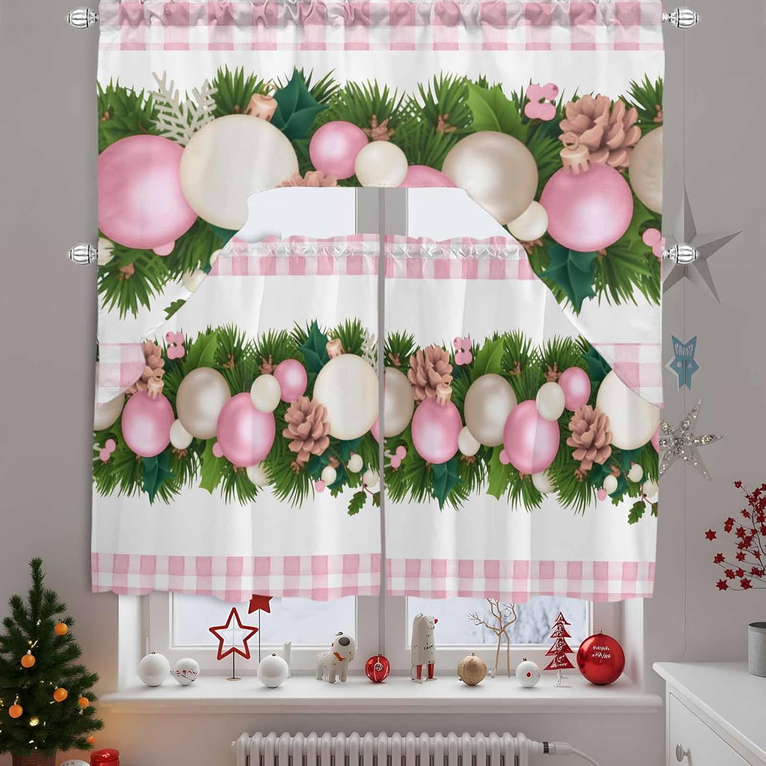 Widely Used: Our universal swag and tier curtain set is highly recommended by many customers as home decoration items.Beautiful and practical rideaux de chambre decoration are not only used in kitchens, bedrooms, dining rooms, living rooms, bathrooms, but also match other occasions, such as home office, laundry room, kids room, nursery, balcony, classroom, pet room, guest room, playroom, study room, washroom, coffee shop, cafe shop and more.Ideal Gift: Are you still worried about what gift to give for Christmas, Halloween, Thanksgiving, Independence Day, Mother's Day, Father's Day, Housewarming, Valentine's Day, St. Patrick, Easter, New Year? Why not take a look at our charming kitchen cafe curtain set, classic designs perfect for gifting to family, friends, colleagues and neighbours, etc.Various Styles: Our window drapery can perfectly match the style of your home.We have retro pastoral style, country farmhouse style, simple modern style, European aristocratic style, romantic French style, etc.Optional Colors: Bright colors are an important part of kitchen curtains sets for windows clearance.We have black, white, grey, red, brown, silver, beige for adults and pink, green, orange, blue, yellow, rainbow, multi-color for kids.Tip: Due to everyone uses different light or monitors, there may be a slight error in the color of the window curtain panels. Don't affect the beauty and use of the product.Just rod pocket curtains, no rods.