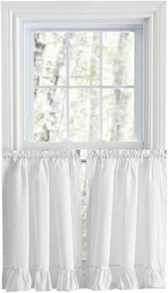 Flirty wide ruffles will add a tailored look to any room. As sunlight filters through and a breeze blows by these charming panels it will bring a breath of fresh air to your decor. Made from a polyester/cotton blend that gives these tiers a sheer look and drape beautifully. Each panel is constructed with a 1.5-Inch rod pocket and 1-inch header. Sold in pairs (2 tiers) width is measured overall 84-inches (both 42-Inch panels together) length is measured overall 30-inches from header top to bottom of tier. For your convenience machine washable. Made in the USA and Pakistan.