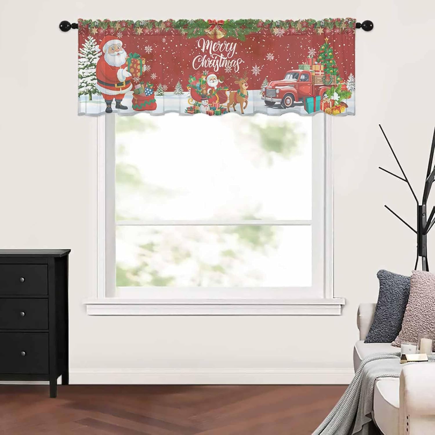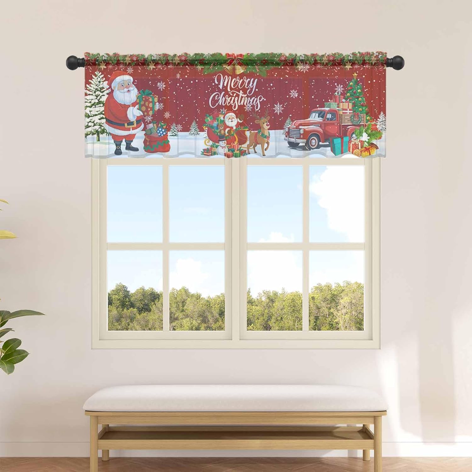 Christmas sheer valance curtains will decorate your windows perfectly, giving your home a charming finish.Chiffon Fabrics Valance- The upgraded chiffon curtains valance are more breathable and hang better than ordinary chiffon curtains.- Curtain valances for living room fabric is softer, less prone to wrinkling, and has strong color fastness.Light Filtering CurtainsSheer window valance allow natural light to flow into the interior, making the entire room bright and warm, allowing you to feel the warmth of the sun in all seasons.Valance curtains for kitchen windows can block the strong ultraviolet rays of the sun and protect furniture from the hazards of prolonged sun exposure.Privacy CurtainsWhen you sleep or work, bedroom curtains valance can block other unnecessary sightlines, providing you with plenty of privacy, and you can freely enjoy your own space.Rod Pocket Curtains ValanceThe 3" rod pocket for valance curtains easily hangs on standard or decorative curtain rods. Bathroom valance pulls smoothly and without sound when opening and closing.Sheer Window Valance DécorFarmhouse valance curtains can meet daily life needs and party decorations. Window treatment are suitable for the decoration of windows in kitchens, bedrooms, bathrooms, laundry rooms, living rooms, study rooms, game rooms, rooms, nurseries, restaurants, cafes, shopping malls, etc. Kitchen curtain valance also can hang at cabinet, have dust-proof effect.Care Instructions- Put the gauze valance curtains in the washing machine and wash them in cold water.- If ironing is required, please use low temperature ironing.- Do not use bleach.Believe that our sheer valance can provide beautiful decoration for your home, and we can provide you with nice service, please rest assured to place an order.