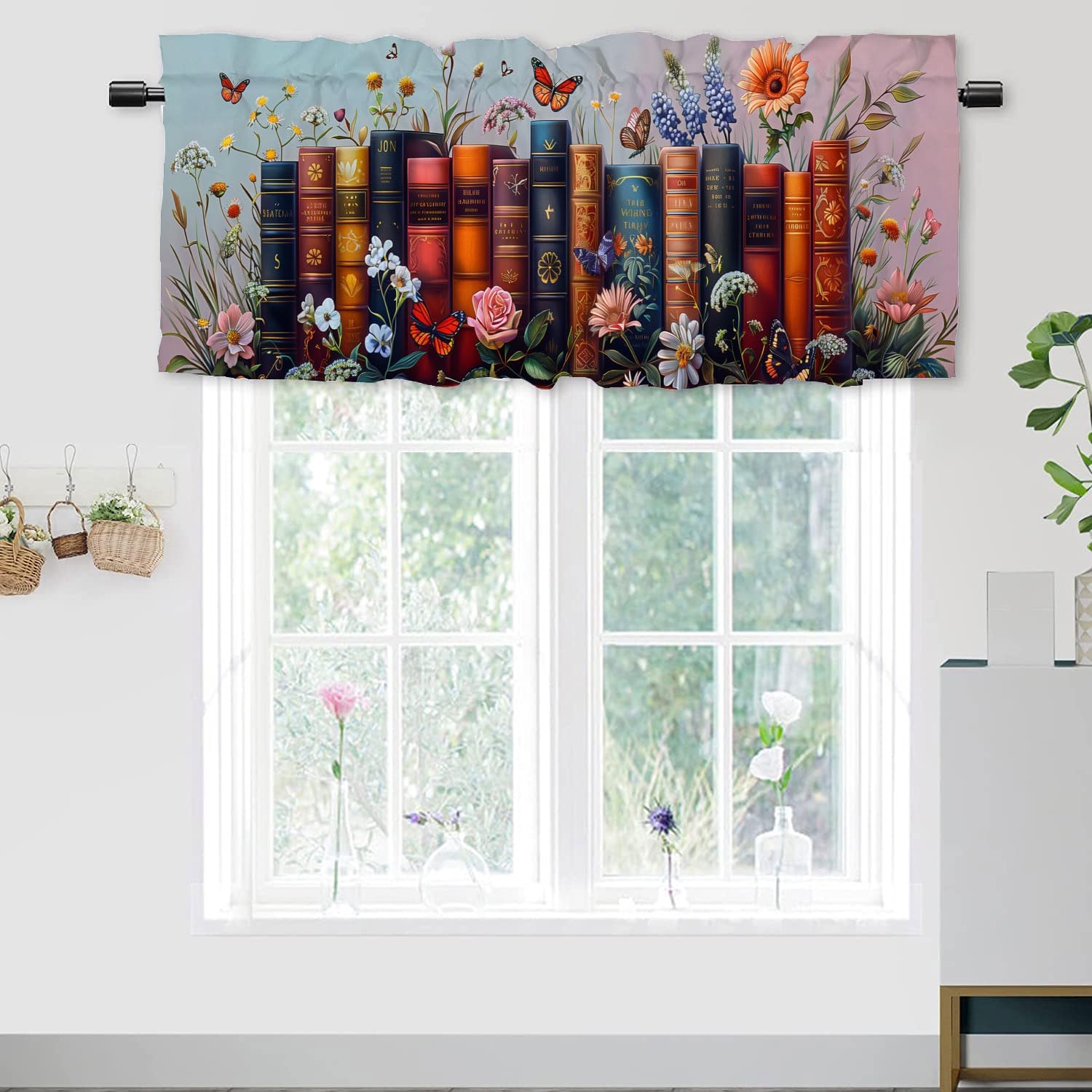 Floral Butterfly Window Curtain Valance Fairytale Books Colorful Butterfly Kitchen Curtains Room Darkening Curtains Rod Pocket can add unlimited charm and fun to your home. Create a more comfortable and unique family atmosphere for you and become an indispensable part of your life!Mindful Workmanship Our valance curtains are made of durable polyester blended fabric, which is moderately soft and can maintain a certain profile. It is undoubtedly an ideal choice for window decoration. In addition, the 3-inch wide rod pocket is more convenient and flexible to apply to more sizes of windows than the grommet valance drapes. (26"-50" wide windows are available). Moreover, when decorating your windows, the top rod pocket can make the valances wavy folds to create more elegant and inviting beauty. All-match Home Decoration The printing of the window valance curtain adopts high-definition printing, full color and vivid pattern, which upgrade your home decoration for easily. Whether your home style is farmhouse/farm, country/rustic, modern, retro, French or Nordic style, this stylish tier curtains can complement it. Valance curtains can also be holiday decorations to increase the atmosphere on important festivals such as Thanksgiving, Halloween, Christmas, and New Year. Unique Holiday GiftsFashionable and elegant curtain decoration will be a funny gift for relatives and friends. It is very suitable for Birthday, Housewarming, Anniversaries and even the upcoming Thanksgiving, Christmas, New Year, Valentine's Day, St. Patrick's Day, etc. Give them a gift!Customer ServiceWe believe that this window treatment will improve your quality of life. If you have any dissatisfaction, please do not hesitate to contact us, your needs are our pursuit!
