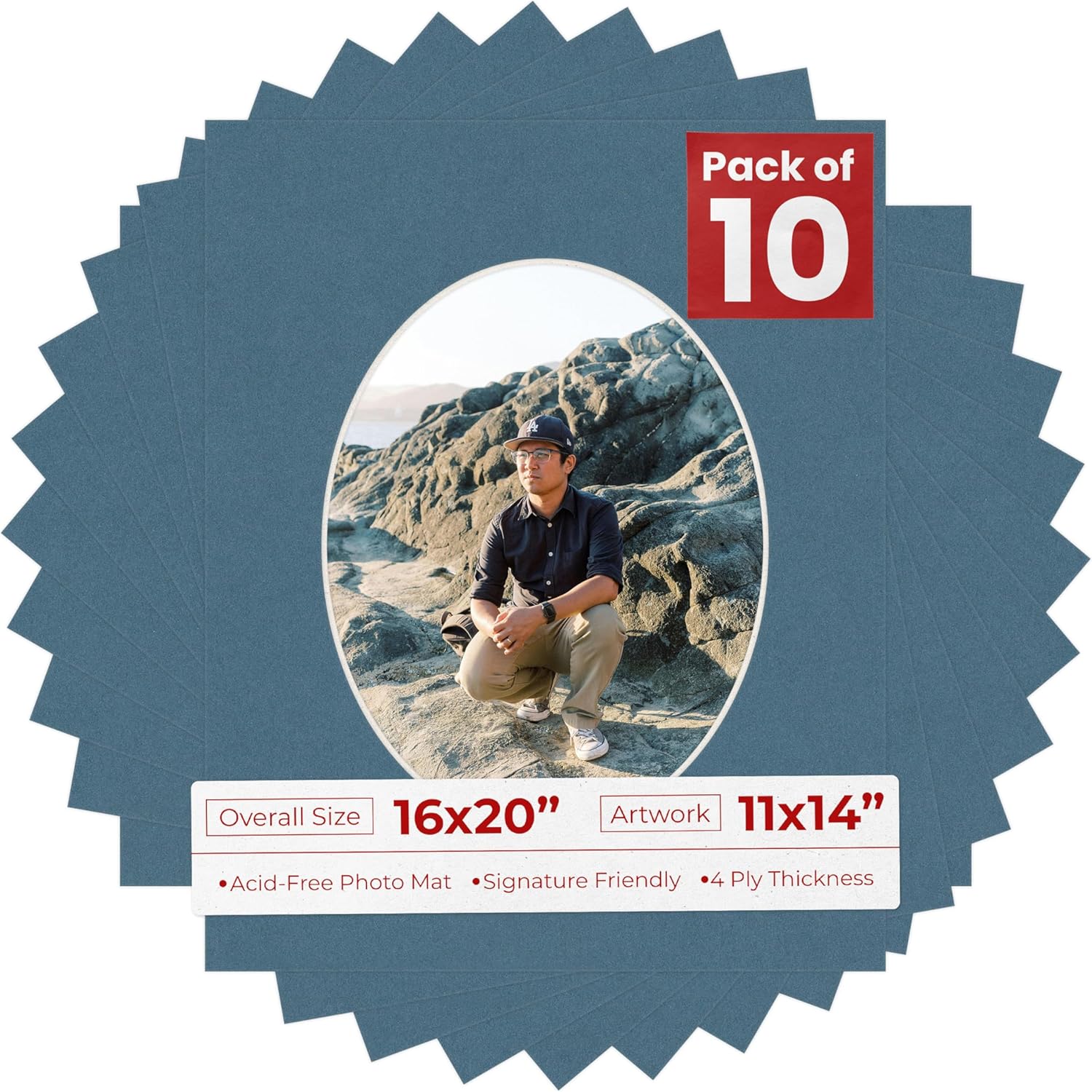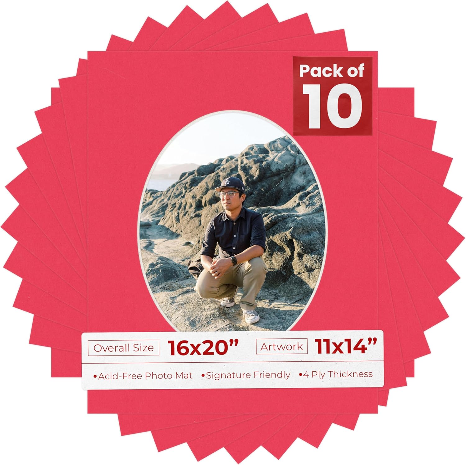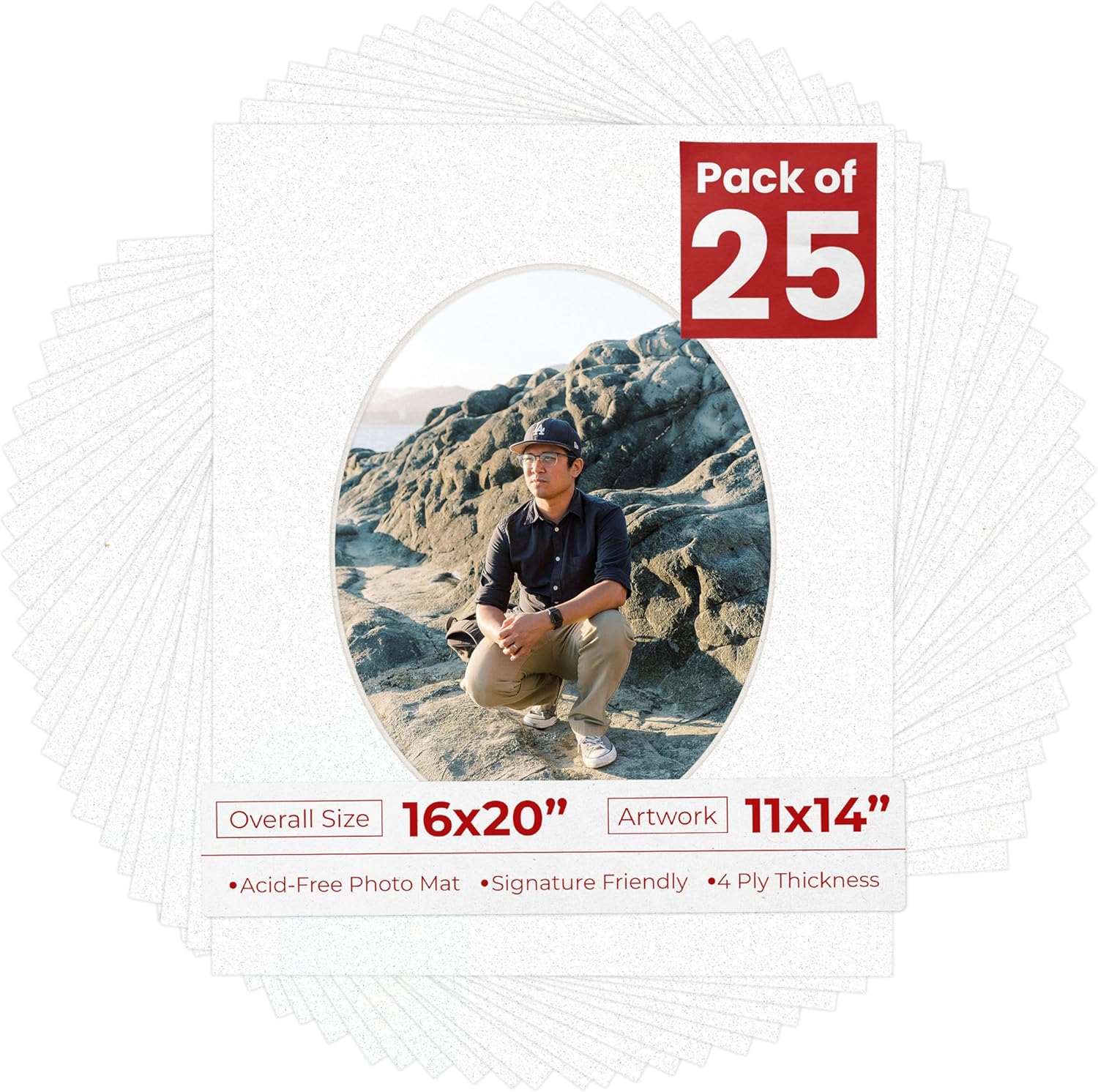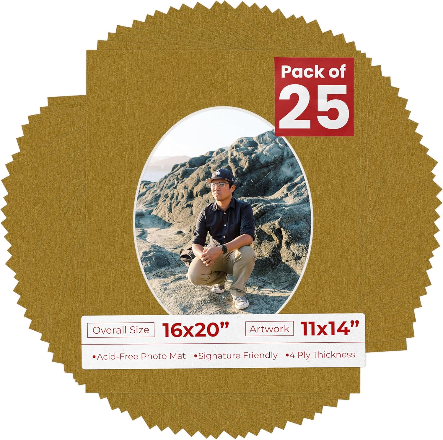 OVERALL SIZE (Made to fit a Frame Size Measuring) 16x20 Inches | Bevel Cut Oval Opening Size of 10.5x13.5 inches | For a Photo Measuring 11x14 Inches. THIS IS FOR 1 single matboard. Rattan beige PHOTO MAT with a oval bevel cut opening. A great way to change up the look of an existing frame with a new accent mat board. This matte also works great as a replacement for damaged, dirty, or faded matting in your old frames. PREMIUM QUALITY: Our precut photo matboards are acid free & precision cut with a 45 degree bevel by machine for perfect corners and NO over-cuts every single time. All of our precut matboards are MANUFACTURED BY POSTER PALOOZA IN THE USA.