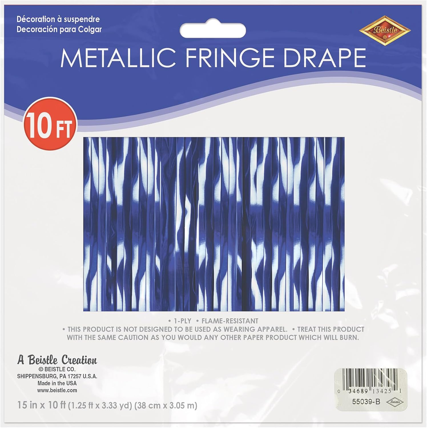 Beistle Metallic Blue Fringe Drape CurtainProudly Made in the USACreate a sleek and stylish atmosphere with the Beistle Metallic Blue Fringe Curtain. This shiny blue 1-ply metallic curtain is perfect for adding an elegant and festive touch to your event. This curtain measures 15 inches high and 10 feet long, providing ample coverage for decorating doorways, walls, tables, or creating stunning photo booth backdrops. Whether you're planning a birthday party, baby shower, graduation celebration, or any themed event, this curtain will add a splash of bold color to your décor. Easy to hang and lightweight, it is designed for a hassle-free setup and will transform any venue into a festive space. Bring sophistication and shine to your celebration with this high-quality, reusable fringe curtain.