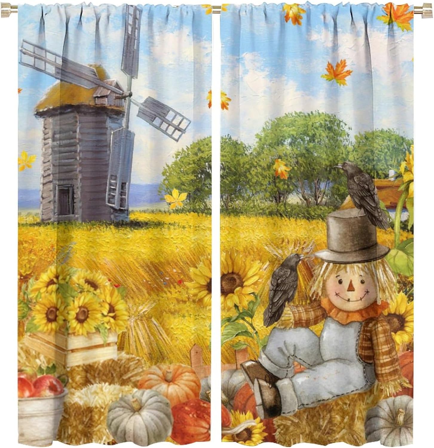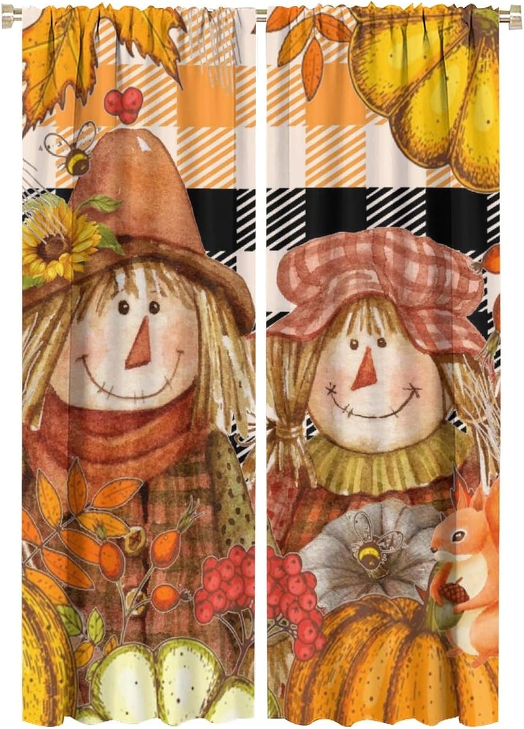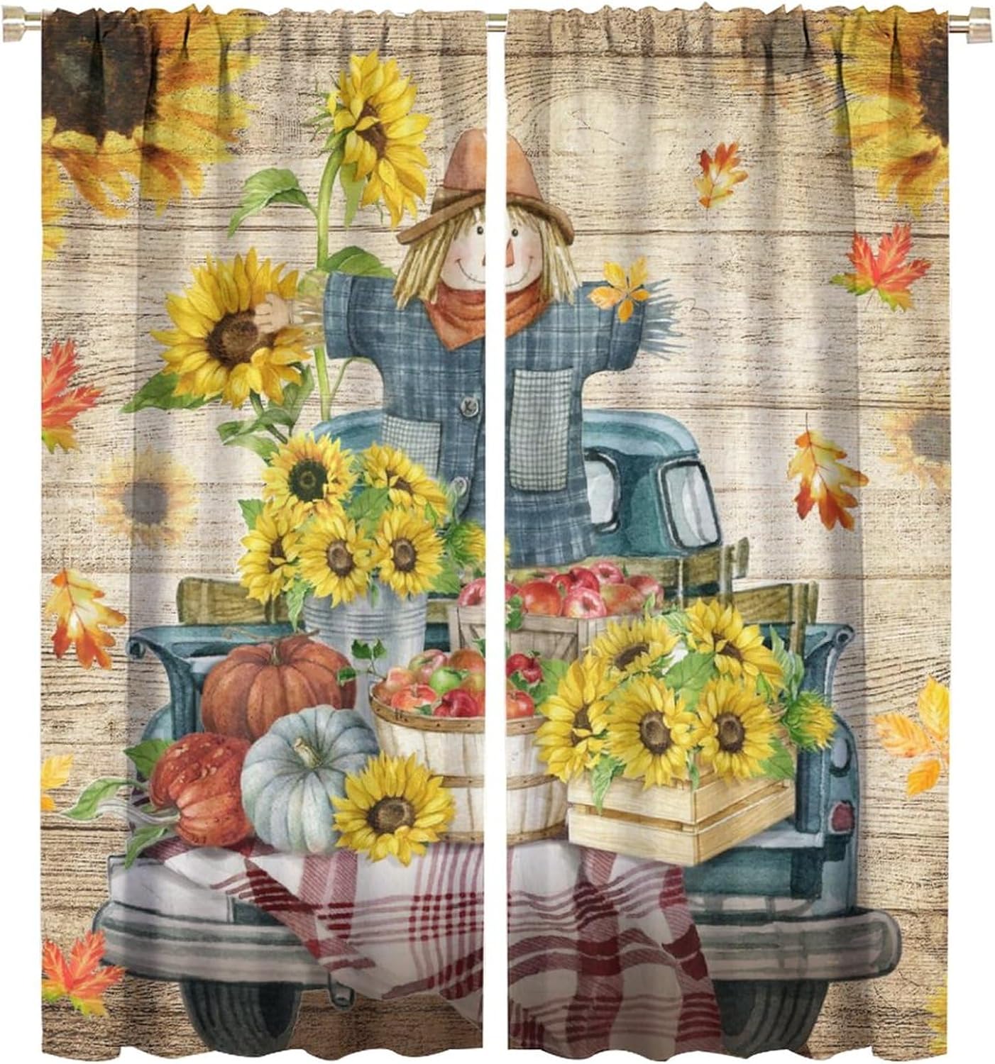 Welcome to our store. Total size: 45" L × 42" W (114cm × 107cm),Includes two pieces,each of which measures:45" length × 21" width (114cm × 53.5cm). Total size: 54" L × 42" W (137cm × 107cm),Includes two pieces,each of which measures:54" length × 21" width (68.5cm × 53.5cm). Total size: 63" L × 42" W (160cm × 107cm),Includes two pieces,each of which measures:63" length × 21" width (160cm × 53.5cm). Total size: 63" L × 55" W (160cm × 140cm),Includes two pieces,each of which measures:63" length × 27.5" width (160cm × 70cm). Total size: 63" L × 63" W (160cm × 160cm),Includes two pieces,each of which measures:63" length × 31.5" width (160cm × 80cm). Total size: 72" L × 63" W (183cm × 160cm),Includes two pieces,each of which measures:72" length × 31.5" width (183cm × 80cm). Total size: 63" L × 72" W (160cm × 183cm),Includes two pieces,each of which measures:63" length × 36" width (160cm × 91.5cm). Total size: 84" L × 84" W (214cm × 214cm),Includes two pieces,each of which measures:84" length × 42" width (214cm × 107cm). People always prefer using some decor to highlight the visual aesthetic. The brebasf Funny Scarecrow Pumpkin curtains is the beautiful choice for bedroom.Good and Healthy materialOur Rustic Fall Farm Maple Leaves Sunflower Autumn Harvest Sunset Pinwheel curtain is made from a safe and durable polyester fabric,a healthy choice for any living room.★ 95% polyester fabric.★ Easy to install. Easy to hang.★ Various style theme design,so that the bathroom is full of color and fun.Note1. Please allow a little bit of size deviation due to manual measurement.2. Due to differences in computer monitors,please allow a little bit of color difference between the picture and the object.