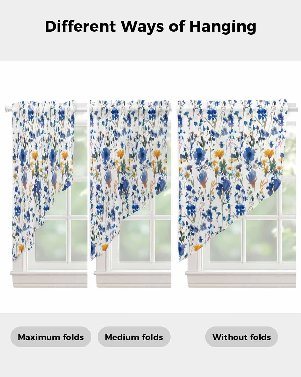 Embrace the Beauty of Life with Our Sheer Swag Curtains. Material: 100% Polyester Opacity: Light-filtering, sheer, semi-sheer Size: 28”Wx36”Lx2, 36”Wx36”Lx2, 36”Wx45”Lx2, 36”Wx63”Lx2 Included Components: 2 Panels Feature: Easy Installation: 3" rod pocket is large enough for most of curtain rods in the market, which is easy to install and move the curtain swags along the rods. Light Filtering and Privacy: Our sheer curtain swag valances for windows softly filter out harsh sunlight and let the breeze flow through your windows, creating a comfortable atmosphere while ensuring privacy. Elegant Design: These window swag curtains feature a beautiful window treatment design with a natural feel can be perfectly combined with any style. Room Type: Sheer curtains with valance are suitable for living room, bedroom, kitchen, dining room, bathroom, laundry room, office and more. Great Gifts: Our exquisite swag kitchen curtains are a great choice gift for Housewarming Parties, Independence Day, Summer Holidays, etc. Notes: 1. Care Instructions: Machine washable in cold water, gentle cycle, tumble dry low, low-temperature ironing. Do not bleach. 2.To ensure you purchase the correct bathroom valance size, please measure the size you need before purchasing.