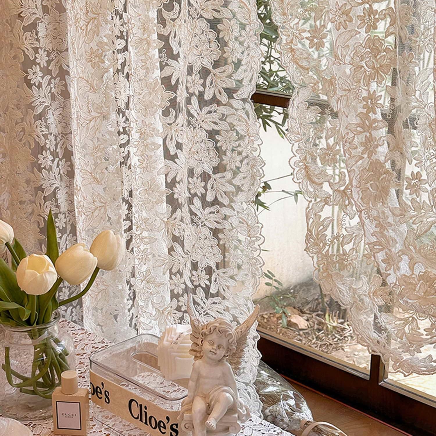 Transform your living space with these exquisite vintage-style lace curtains. The delicate floral embroidered pattern creates an enchanting interplay of light and shadow, while the beige-colored sheer voile fabric gently filters natural sunlight for a warm, inviting atmosphere. Each set includes two panels featuring a convenient rod pocket top design for effortless installation and beautiful scalloped ruffle edges that add a graceful finishing touch. The light-filtering design provides an ideal balance of privacy and brightness, making these curtains perfect for living rooms, dining areas, or bedrooms. Crafted from premium lace and voile fabric, these curtains showcase intricate embroidered details that bring a touch of vintage-inspired beauty to your home decor while maintaining an airy, open feel. The versatile beige color and rustic design elements complement both traditional and contemporary interiors.