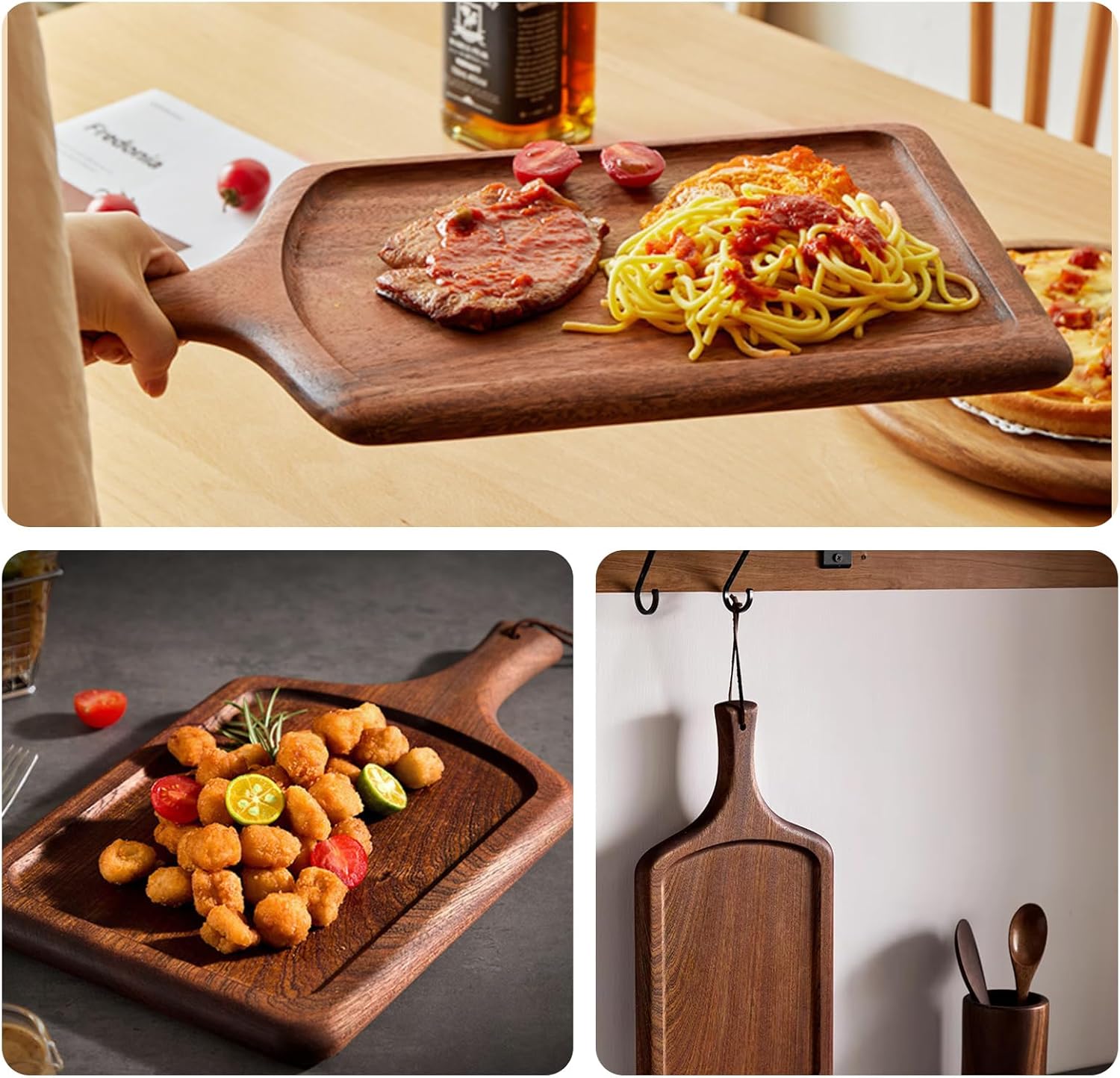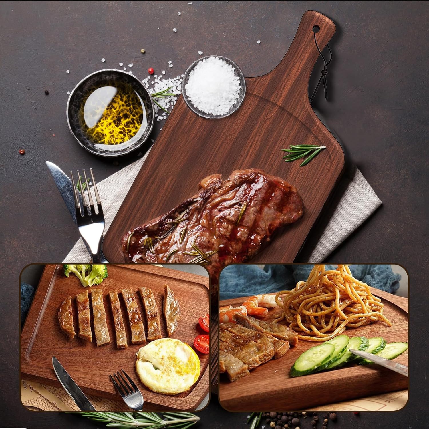 The steak plate is made of 100% solid wood for durability. With natural wood texture and smooth surface without wood chips, it is practical and environmentally friendly. Comfortable and rounded handle design, groove design can effectively put to prevent juice exposure. The handle is equipped with hanging holes and lanyards, easy to hang. The steak plate is washable and wear-resistant, and can be cleaned with water to remove most of the vegetable stains. The front side of the groove can be used to store steak or other cooked food, and the back side can be used to divide small portions of vegetables. Not only can it hold steaks and other meats, but it can also be used for desserts and fruits.