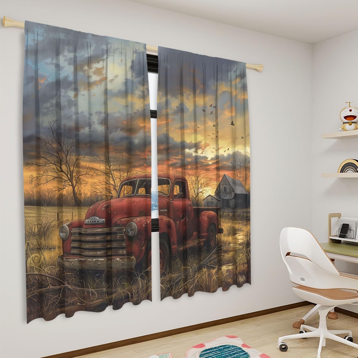 These print curtains are perfect for Living room, bedroom, kids room, kitchen, yard, patio, parlor, sliding door with Farm Vintage Truck, Rustic Red Tractor Barn pattern.- Unique design:· Save energy costs by insulating against heat and cold.· Reduce noises from busy streets and high-traffic areas.· Protect furniture from sun damage and fading.· Provides complete privacy when needed· Perfect for any bedroom, office kids room and living room.- Package Included:· Blackout window curtains 2 Pcs set ( two panels).- Material:· Our Blackout Curtain Liners are crafted from a long lasting soft and thick triple weaved blackout fabric which can block out sunlight and UV rays. The darker color of the fabric, the more light it can block.- Easy Care Instructions:· Machine washable in cold water· Do not bleach.· tumble dry on low· low temperature ironing- Notes:· For your curtains to be more perfect, please choose a size 5-10 Inch larger than the actual window width.· here may be slight differences in colors on different displays.